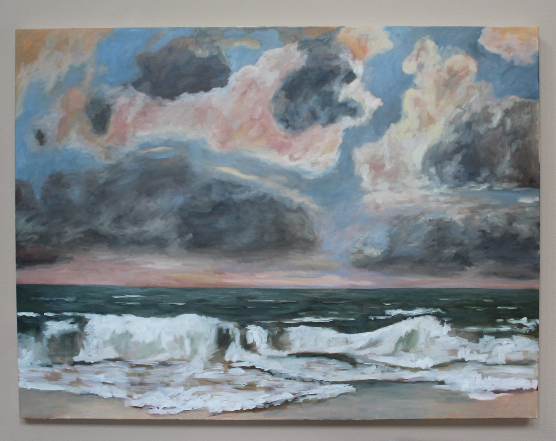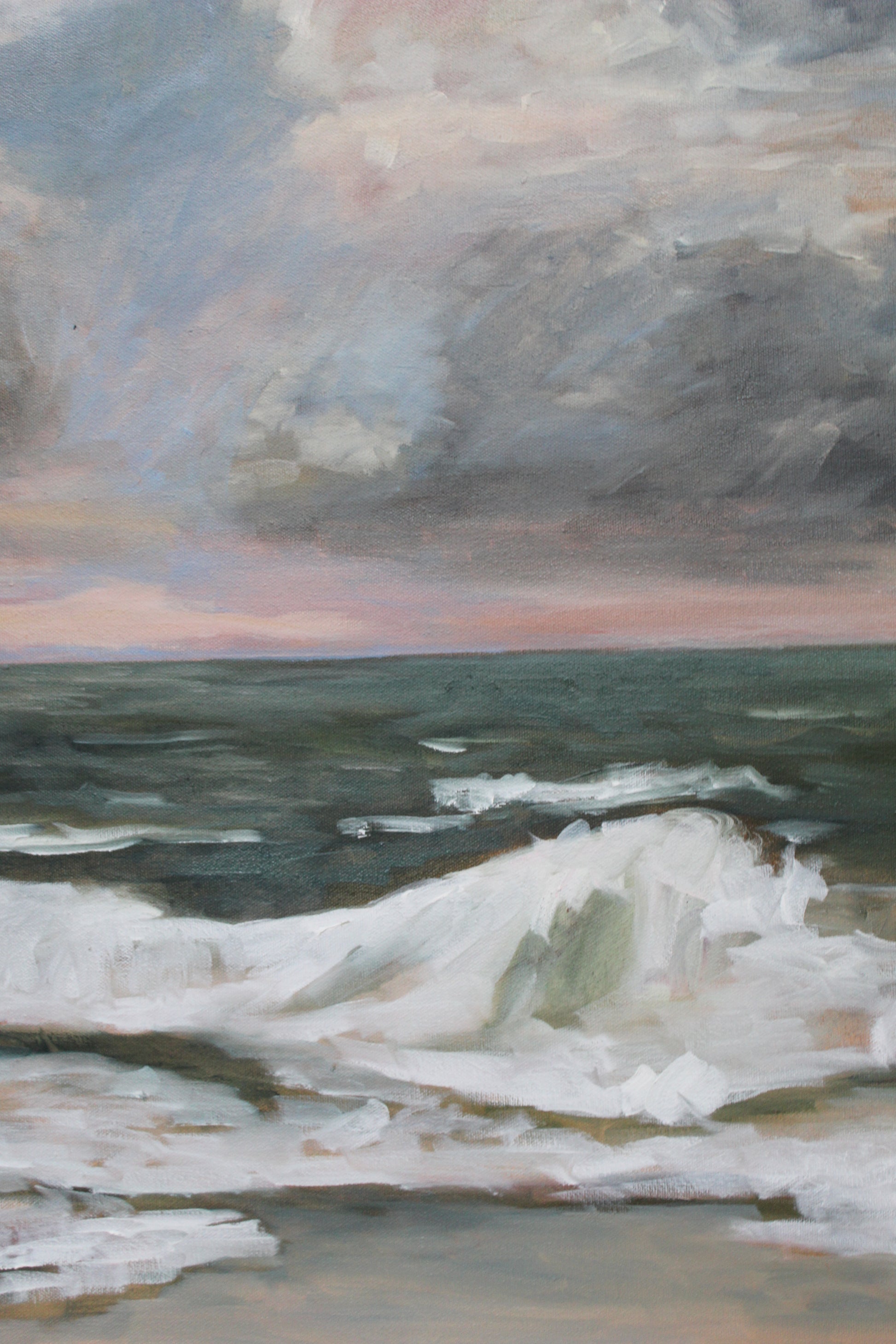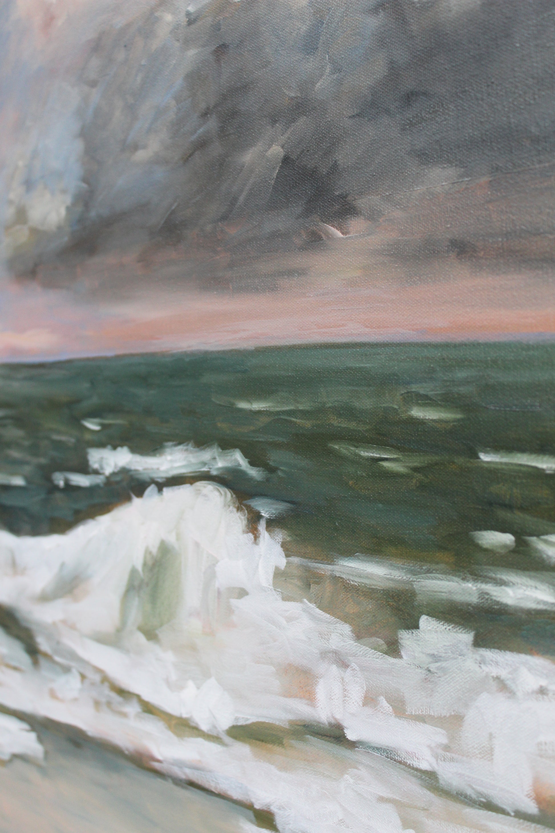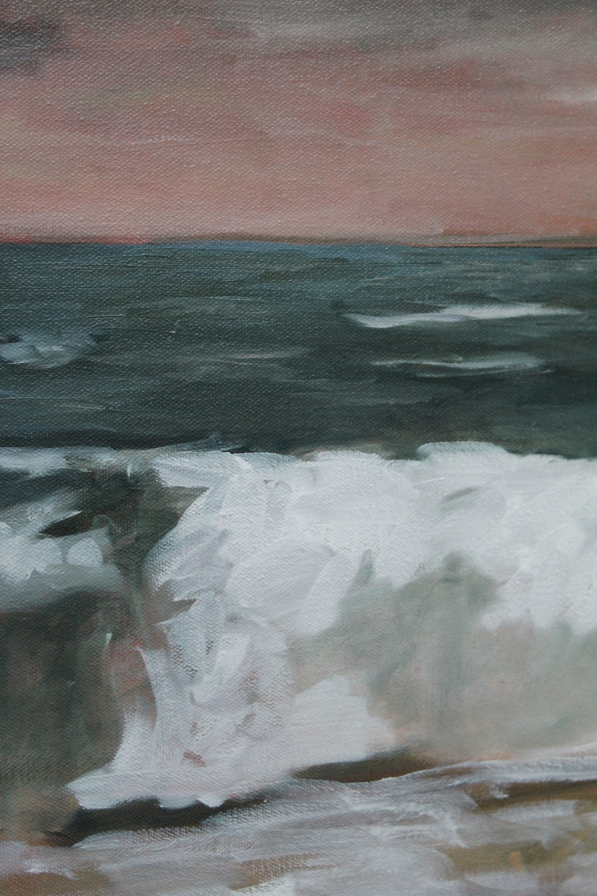 As Time Goes By captures the beauty of a shoreline at day’s end. The scene invites viewers to watch the final waves roll in beneath a sky awash in soft pinks, warm oranges, and moody clouds. The water shimmers in blue-green hues, holding both the lingering warmth of daylight and the promise of the evening ahead.