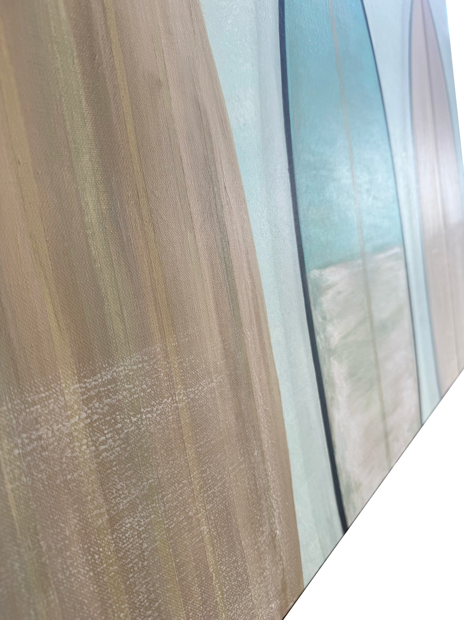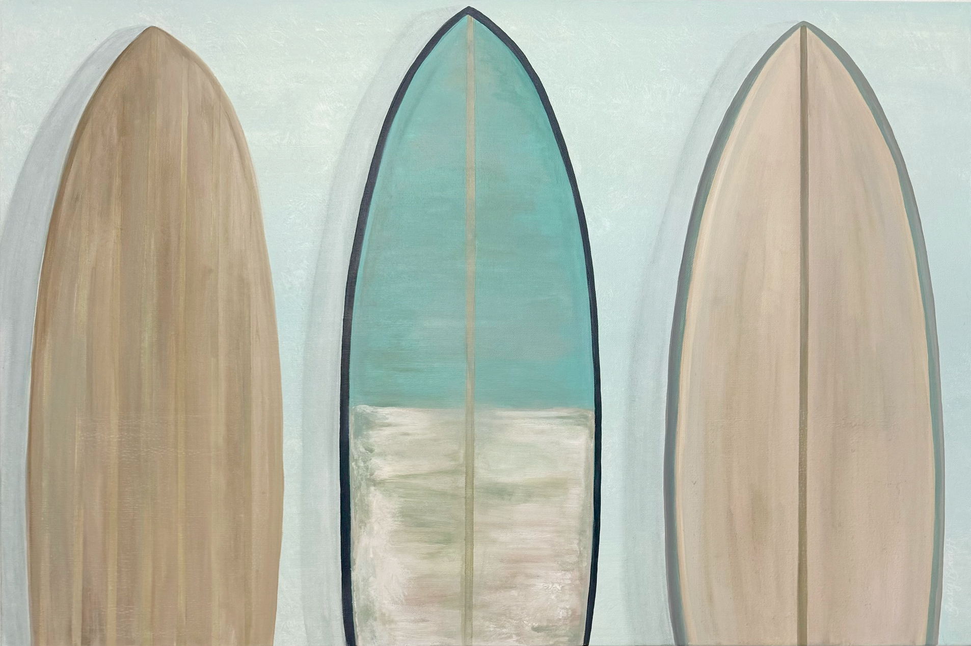 “Boho Boards” brings together three surfboards in a balanced composition that feels both coastal and effortless. Soft wood tones frame a sea-glass center board.