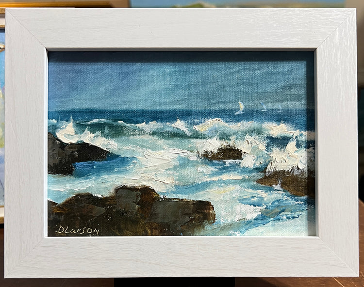 Southbound captures the untamed energy of waves breaking against rugged coastal rocks, rendered in Diane Larson’s expressive oil technique. With rich texture and a palette of deep blues, foamy whites, and earthy browns, the scene feels alive with movement and salt air.