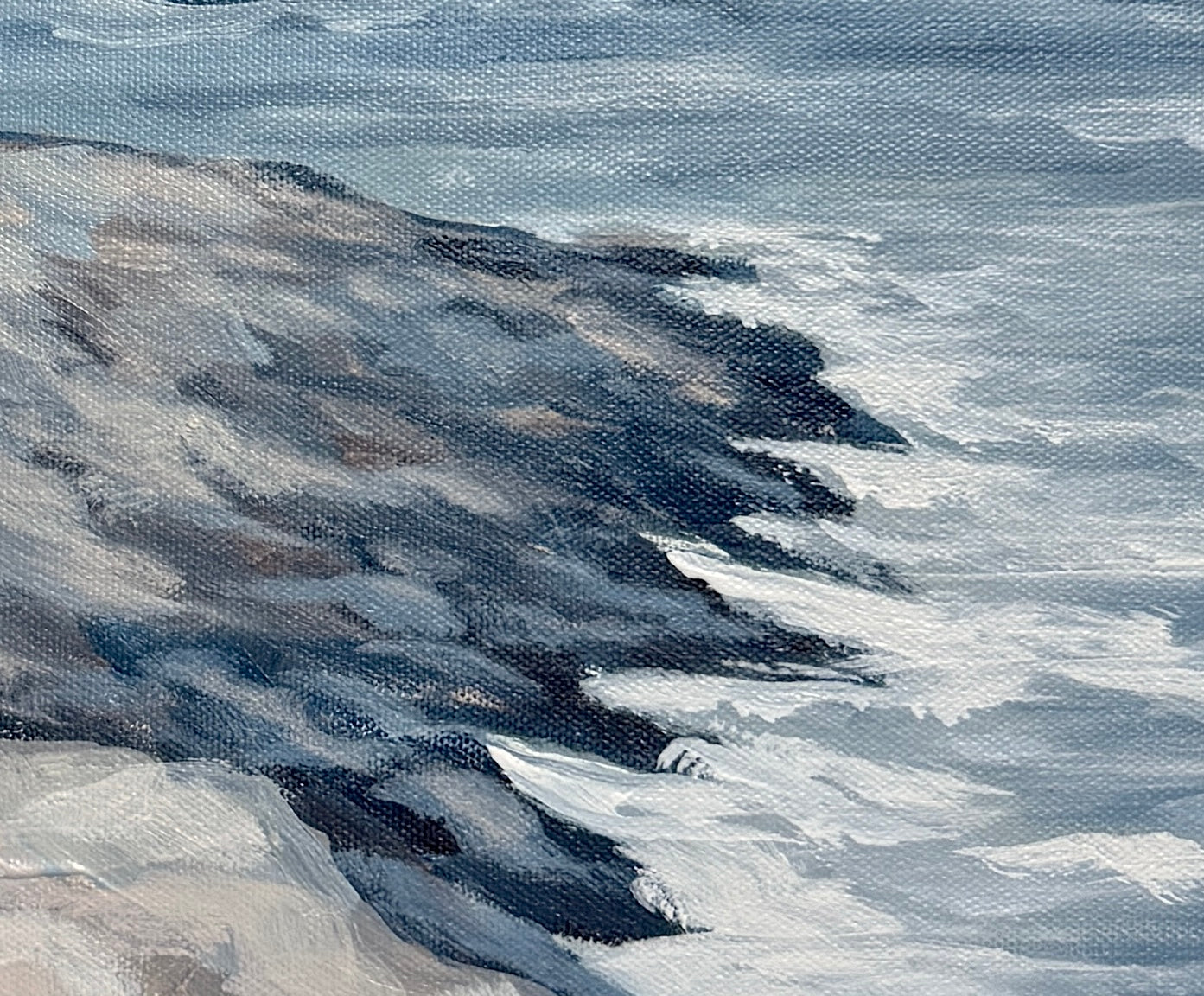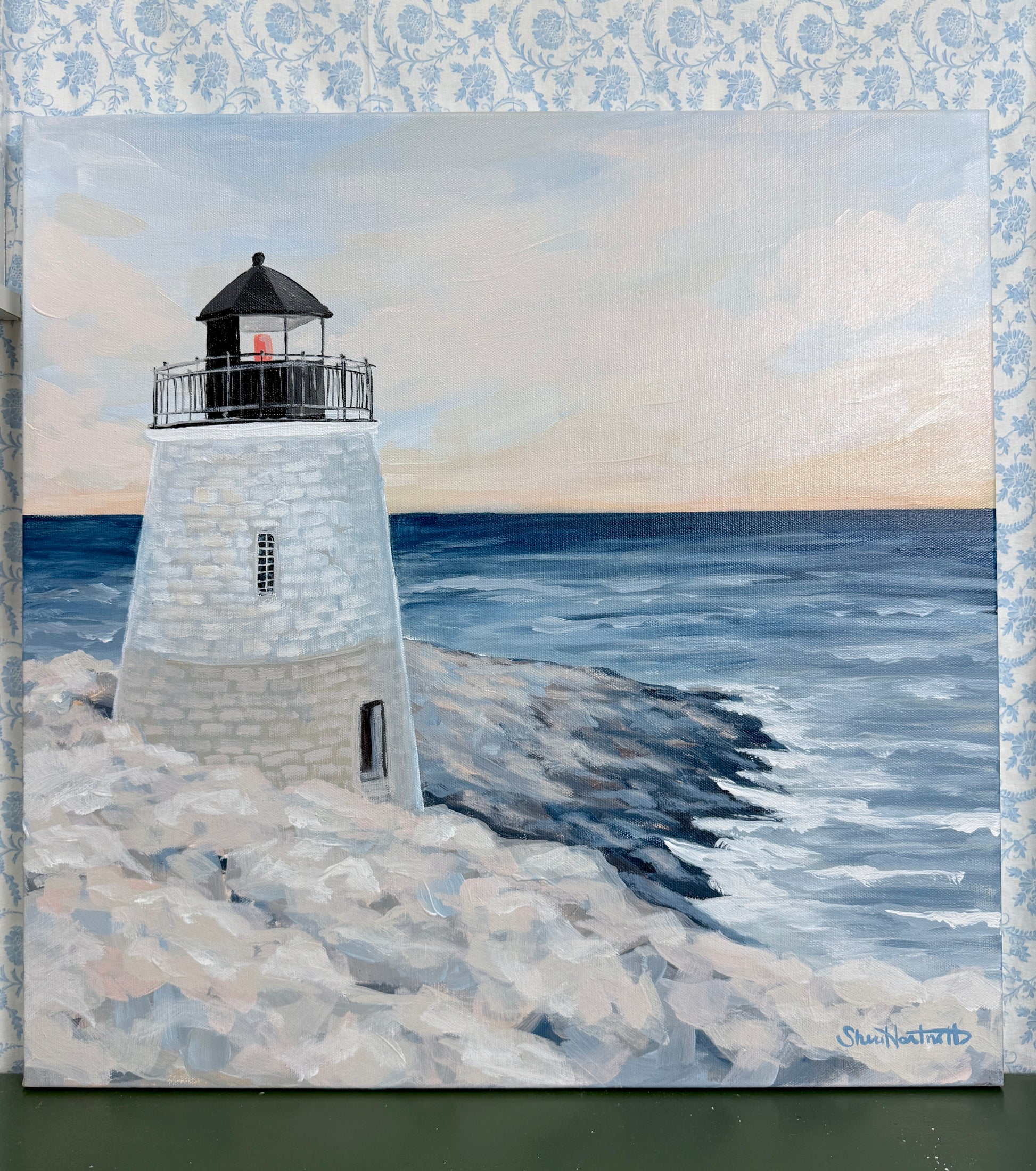 “Castle Hill Lighthouse” captures the solid strength of a coastal landmark beneath a glowing sky. Waves break against the rocky edge while soft tones of gray, blue, and blush give this scene a dreamy yet grounded energy.