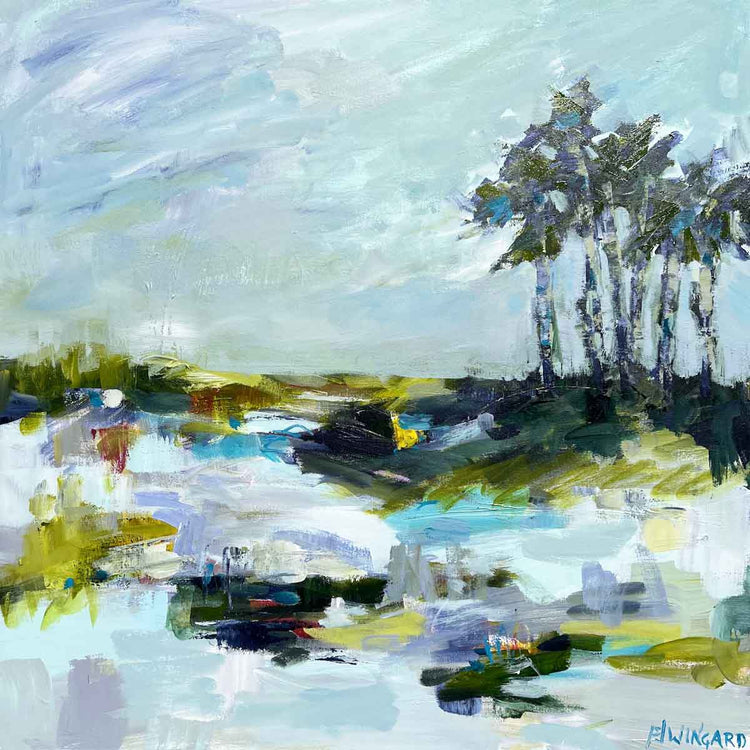 “Cozy Afternoon” brings a vibrant, playful energy to the marsh. With blues, greens, and lavender tones mingling together with bold, expressive brushstrokes. You can practically hear the birds overhead and feel the sun catching the water just right. It’s that wide open view that never gets old.