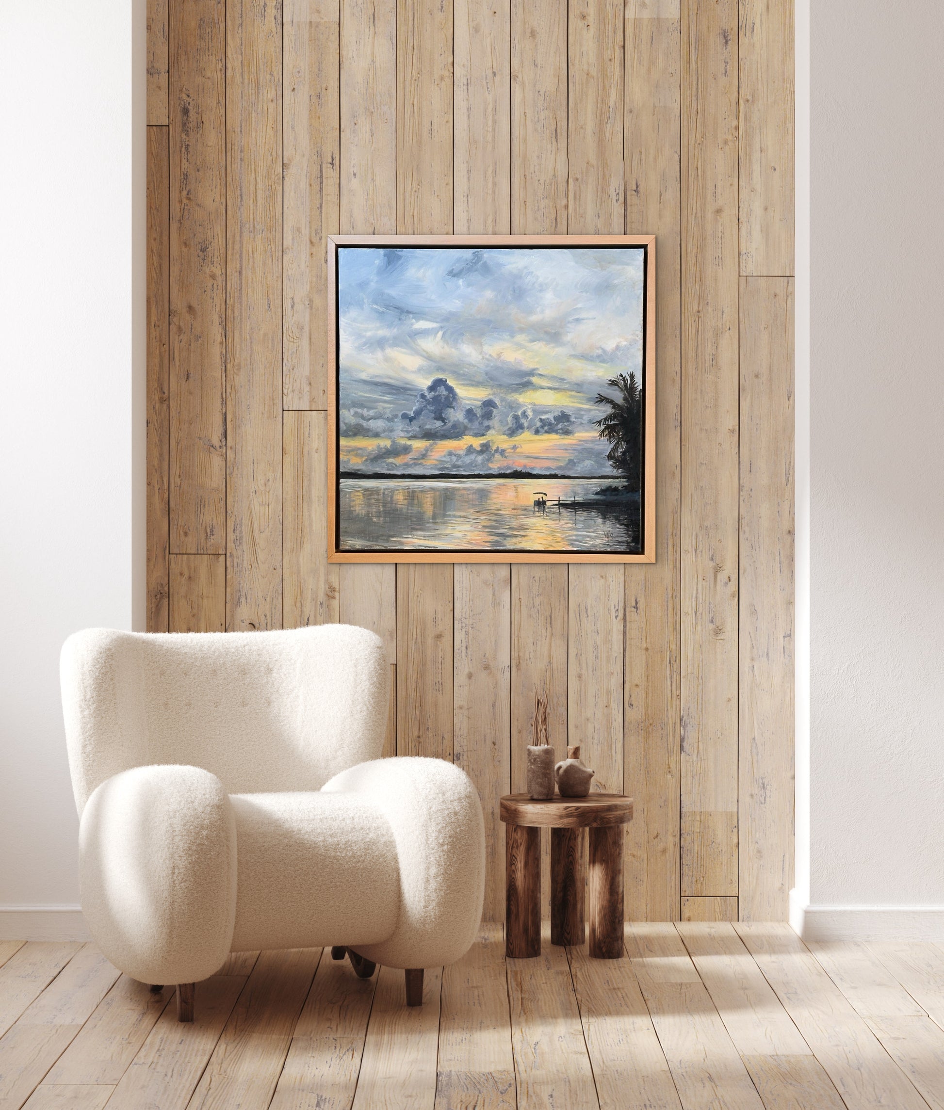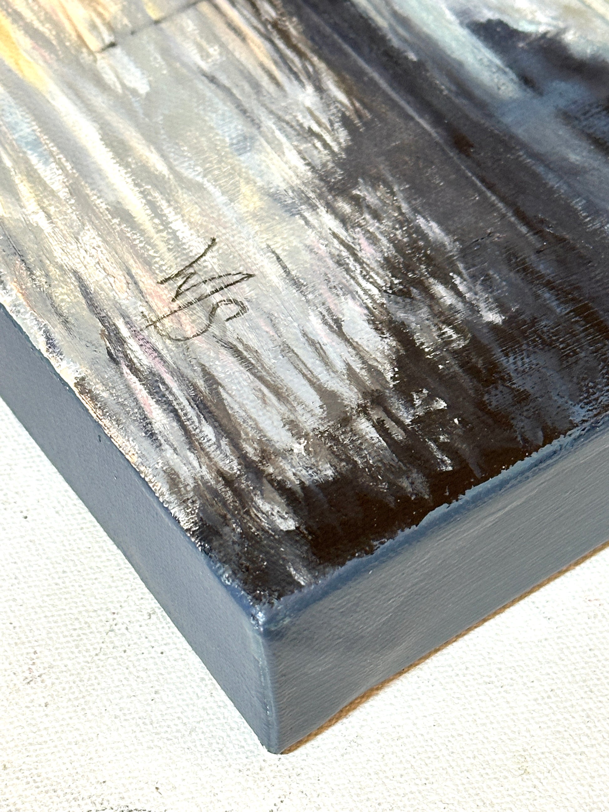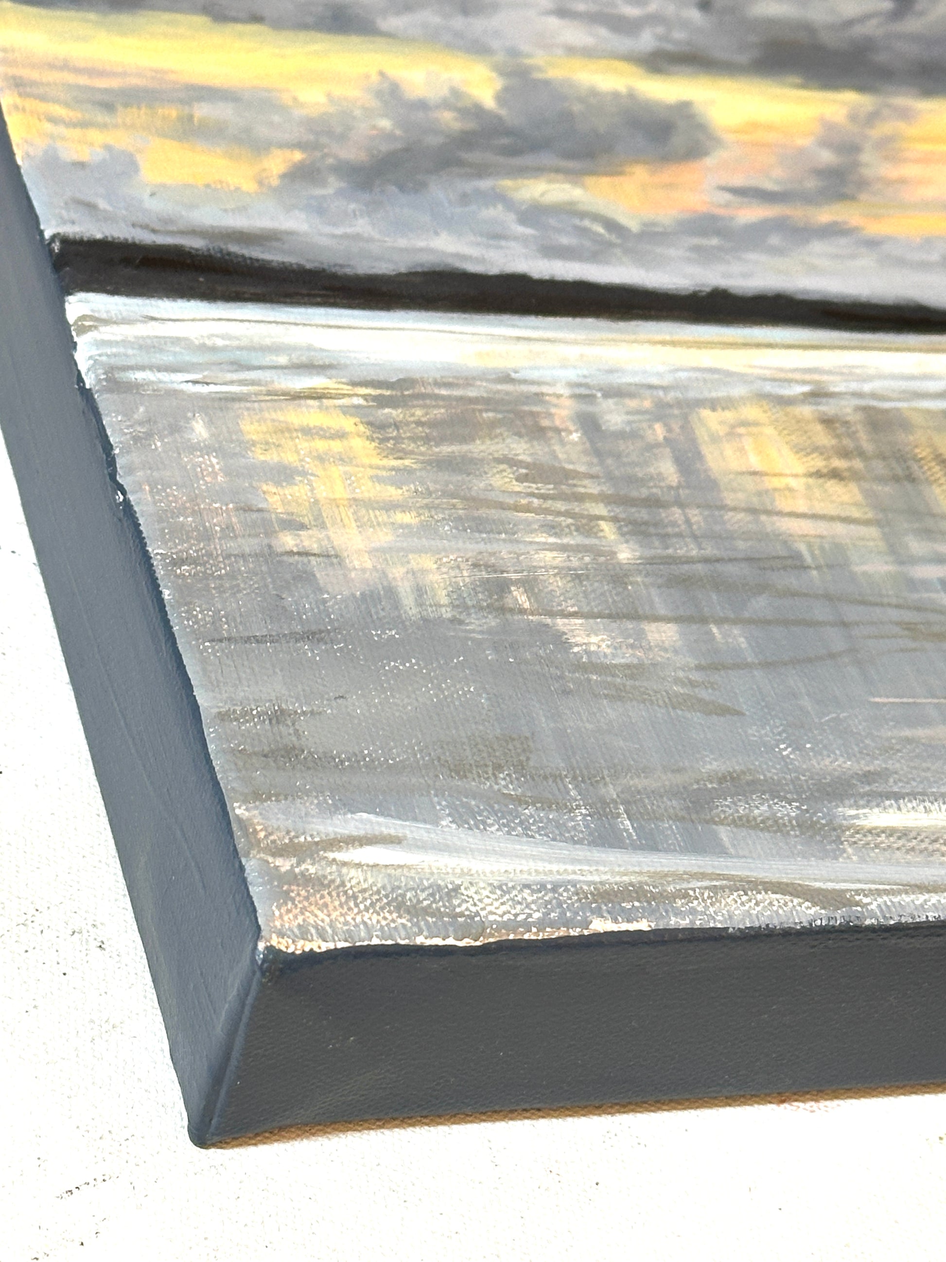This piece feels like early morning stillness before the world fully wakes up. When the air is heavy, the sky stretches wide, and everything feels a little slower. Dawn’s Gentle Embrace is a rich, moody seascape where golden light starts to break through the clouds, reflecting off glassy water. The silhouette of a distant dock adds just enough contrast.