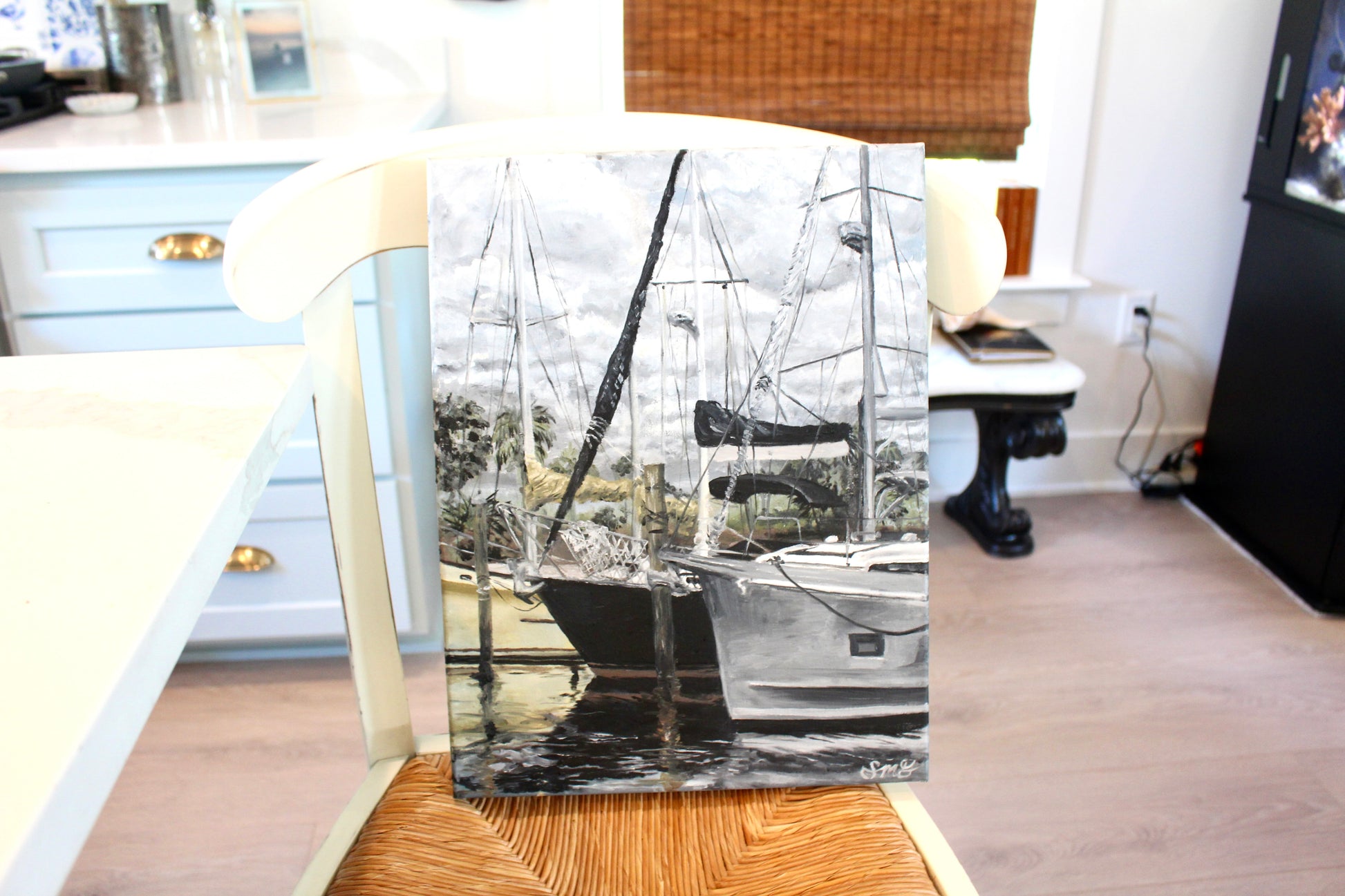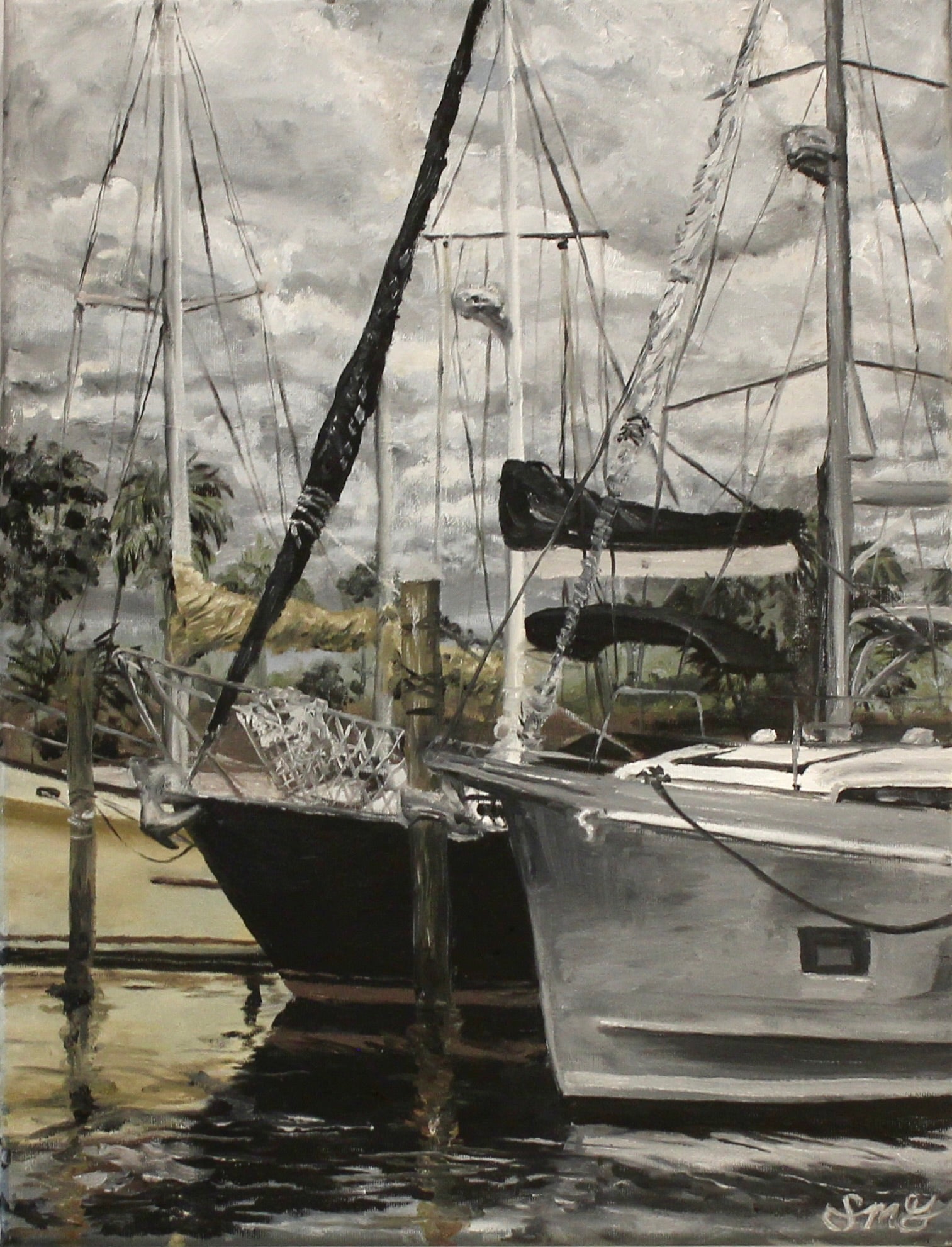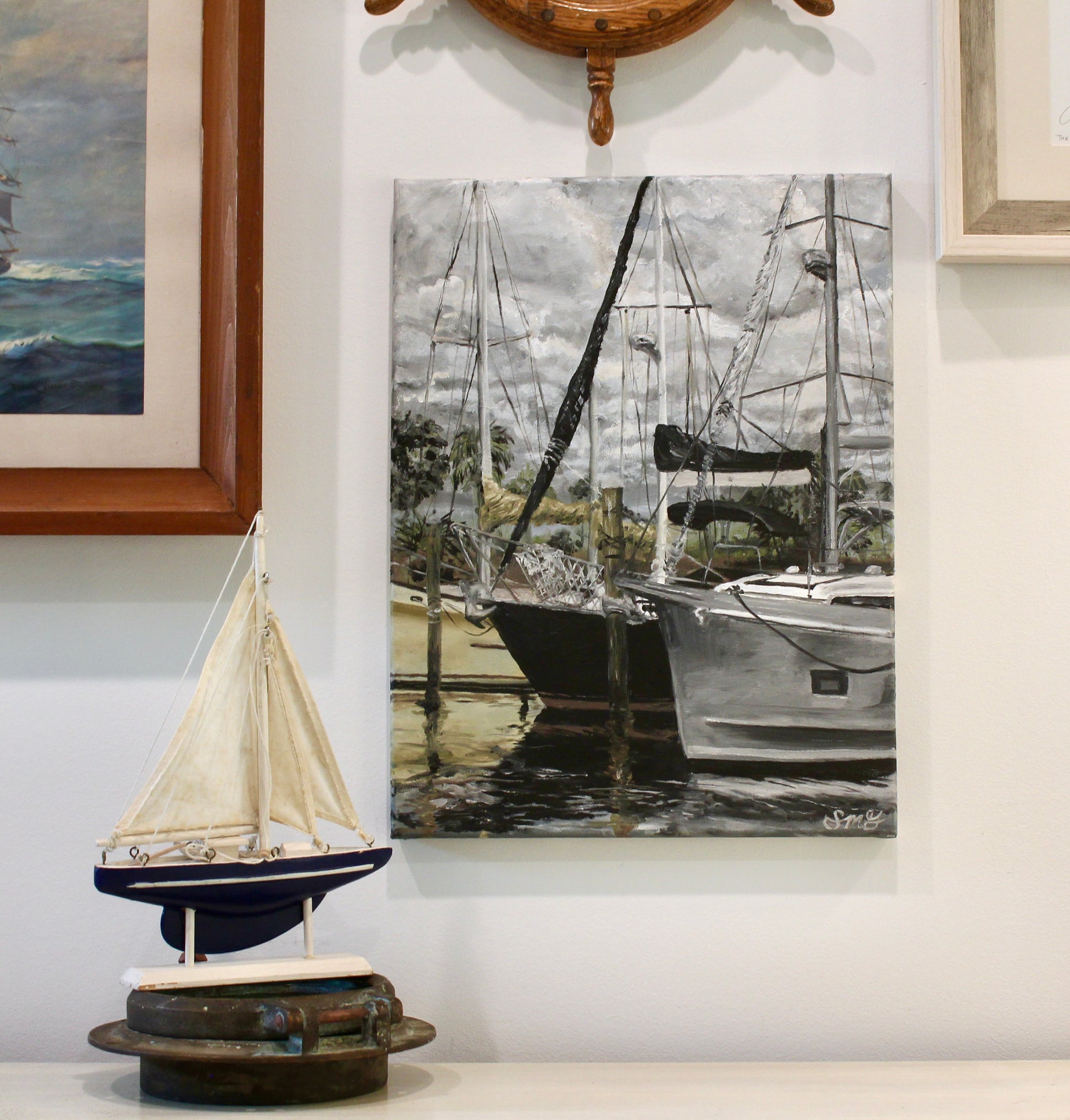 Day of Rest captures a serene marina scene in Panama City, where sailboats rest peacefully in their slips beneath an overcast winter sky. Inspired by a leisurely Christmas Day boat ride with her family through the bays, marinas, and inlets of her hometown, Stacy Graham reflects the quiet beauty of still waters and the steadfast presence of trusted vessels. The soft, muted tones and gentle reflections create a sense of calm, offering the viewer a moment of pause and tranquility.