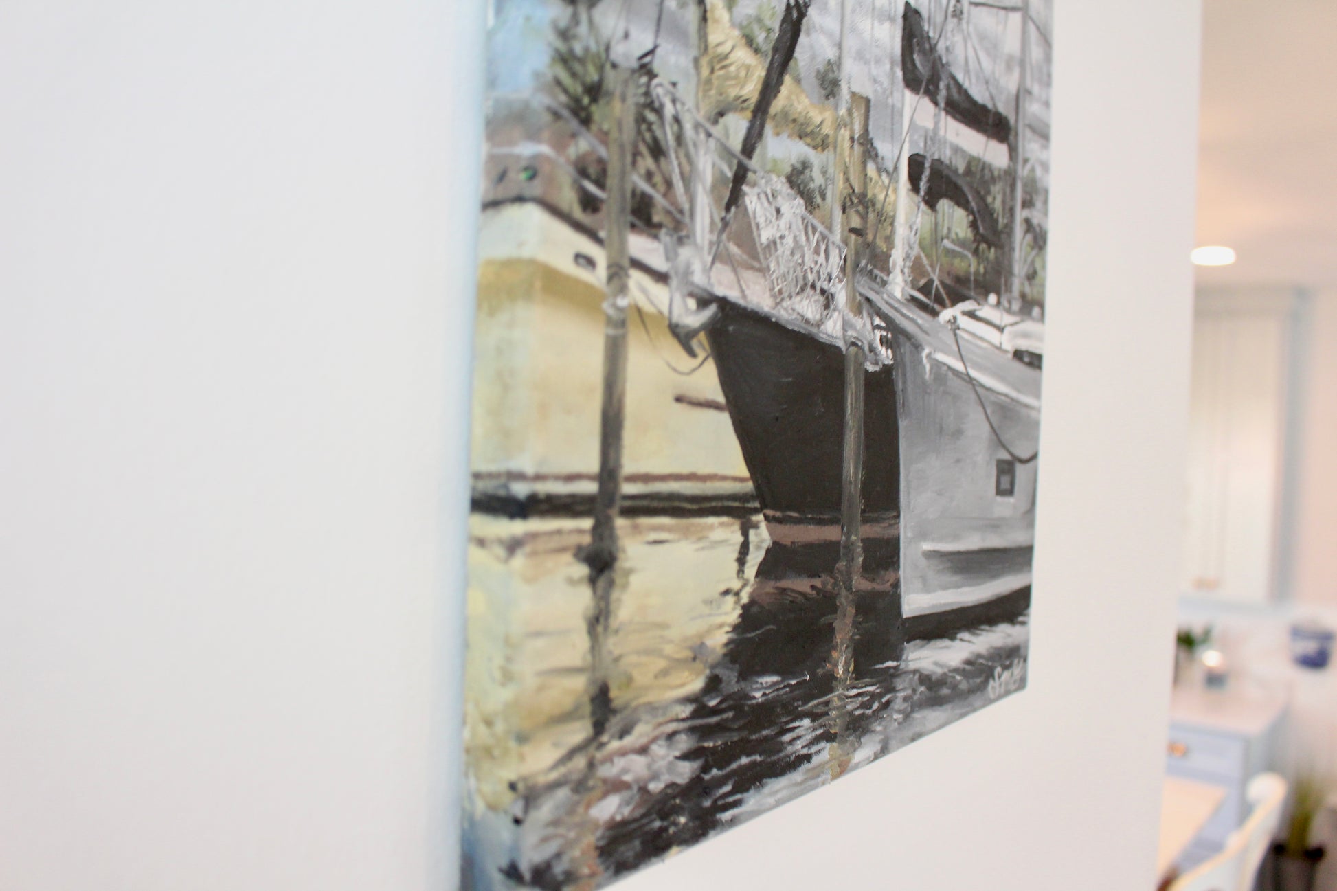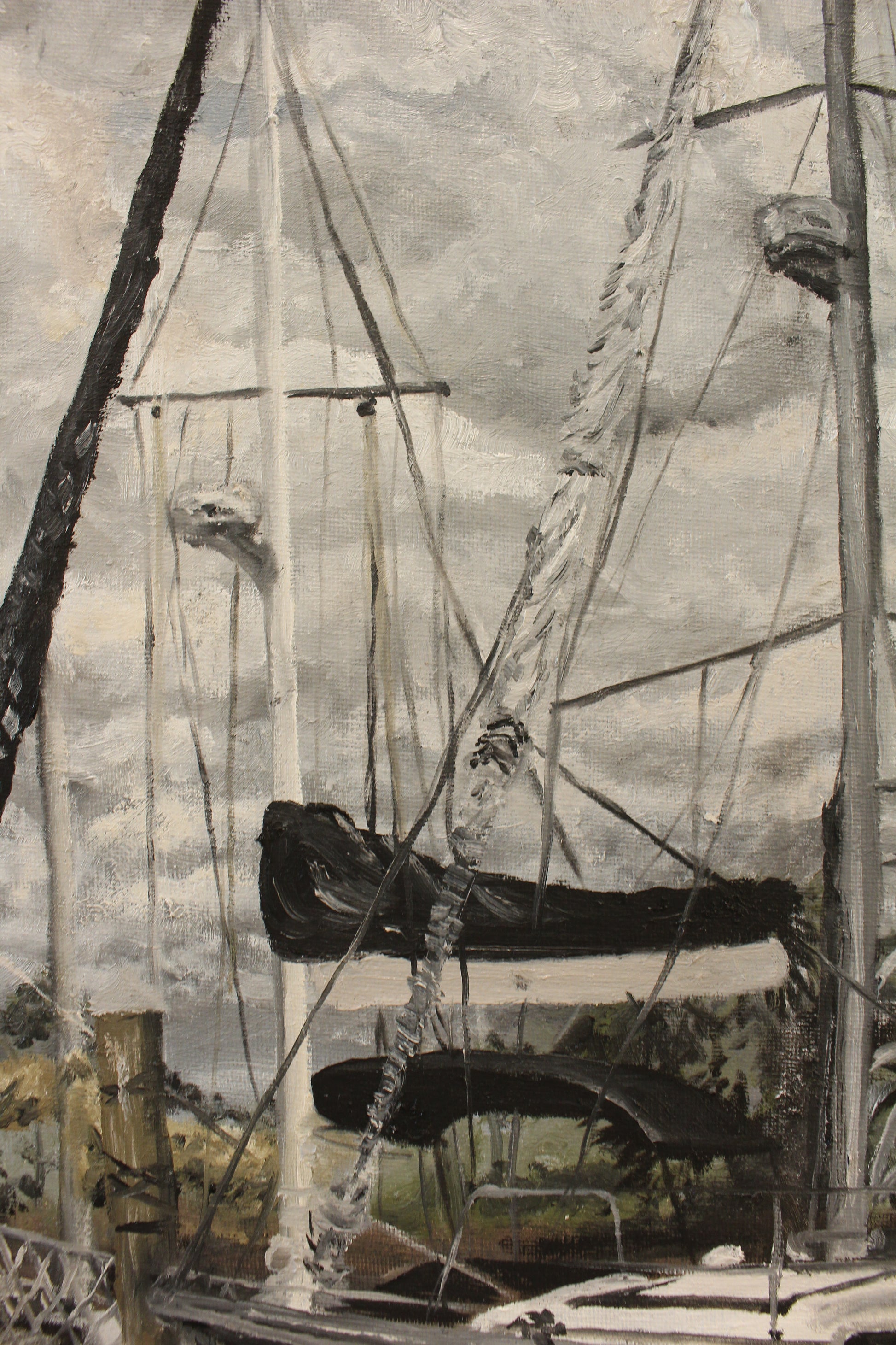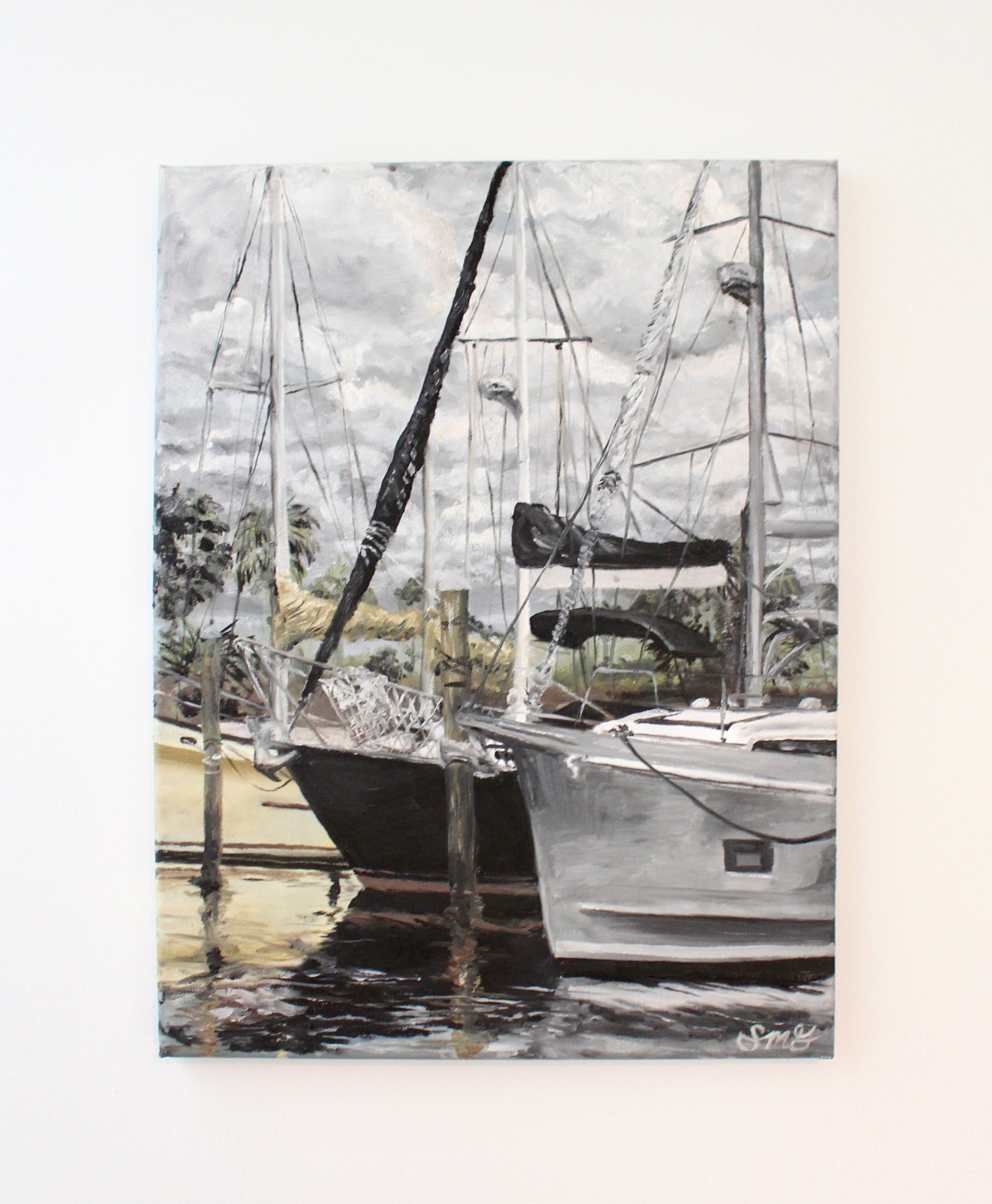 Day of Rest captures a serene marina scene in Panama City, where sailboats rest peacefully in their slips beneath an overcast winter sky. Inspired by a leisurely Christmas Day boat ride with her family through the bays, marinas, and inlets of her hometown, Stacy Graham reflects the quiet beauty of still waters and the steadfast presence of trusted vessels. The soft, muted tones and gentle reflections create a sense of calm, offering the viewer a moment of pause and tranquility.