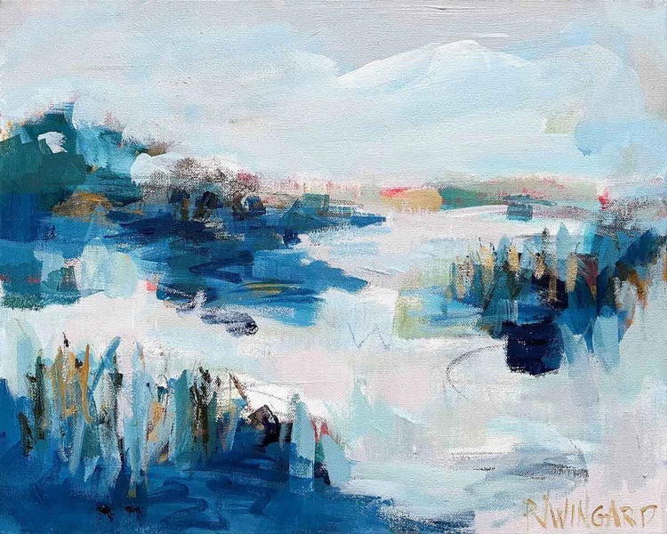 This one feels like a long exhale. Daydream is loose, expressive, and dreamy. With coastal blues and blush undertones that meet layered marsh grasses and abstracted reflections. You can almost hear the water lapping and the wind cutting across the inlet.