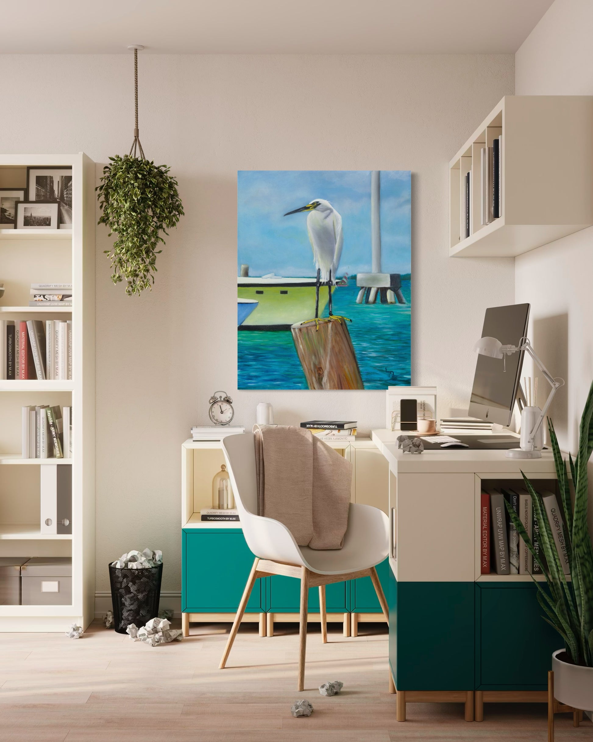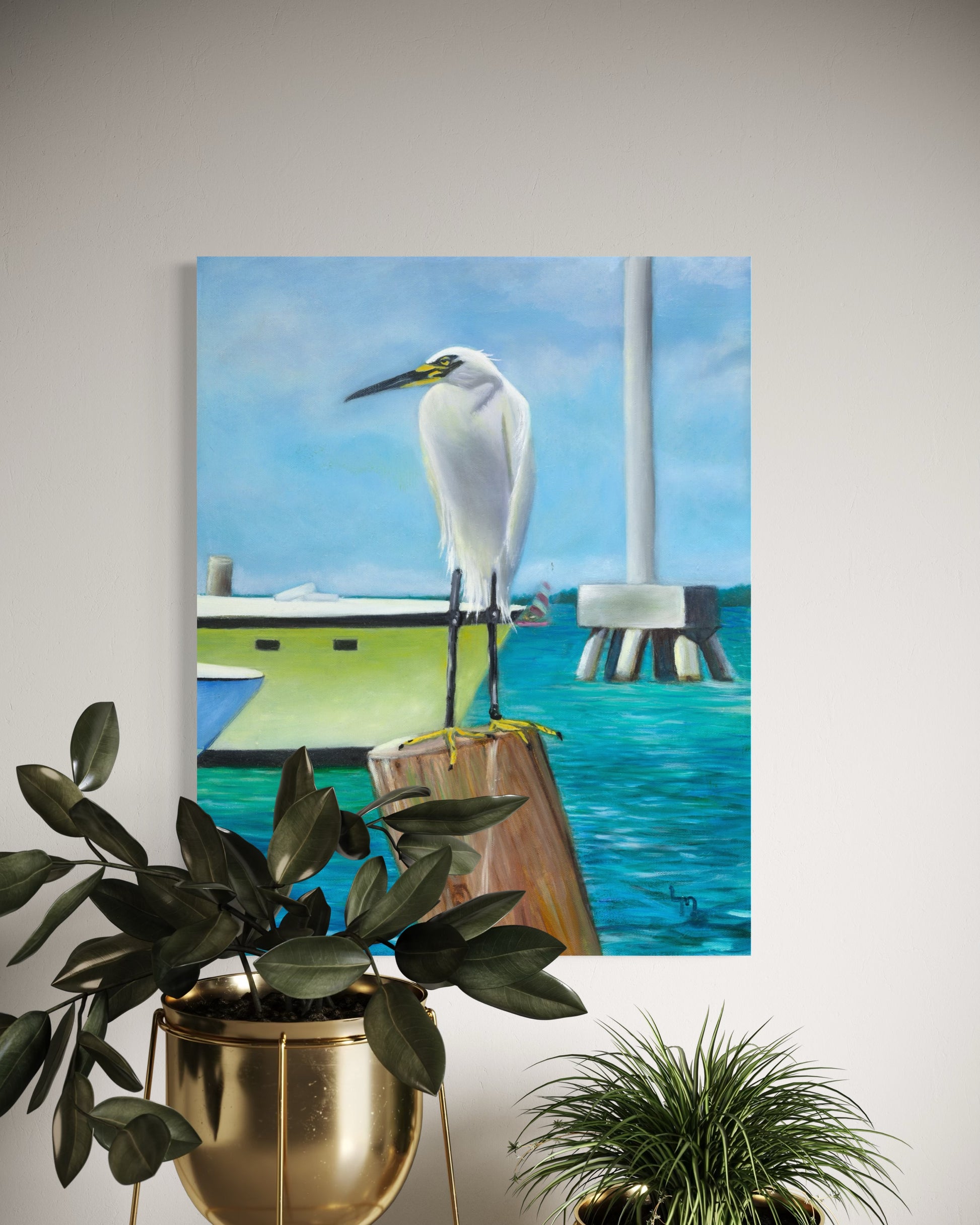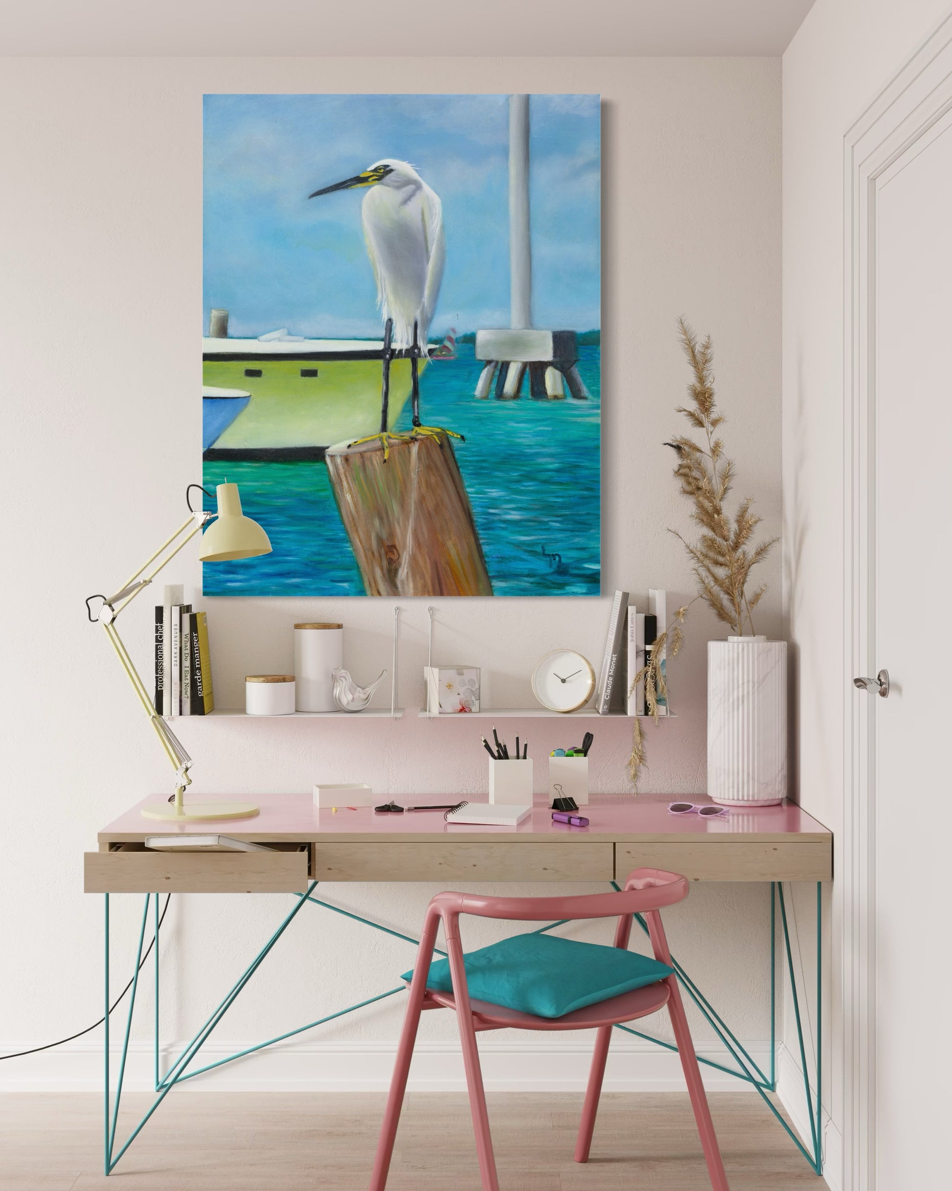 Laura Steinhauer captures a familiar waterfront scene many coastal locals recognize; an egret keeping watch near docks and marinas. The strong vertical lines of the post and the clean horizon give the painting a balanced, steady feel that works well in both casual and curated interiors.