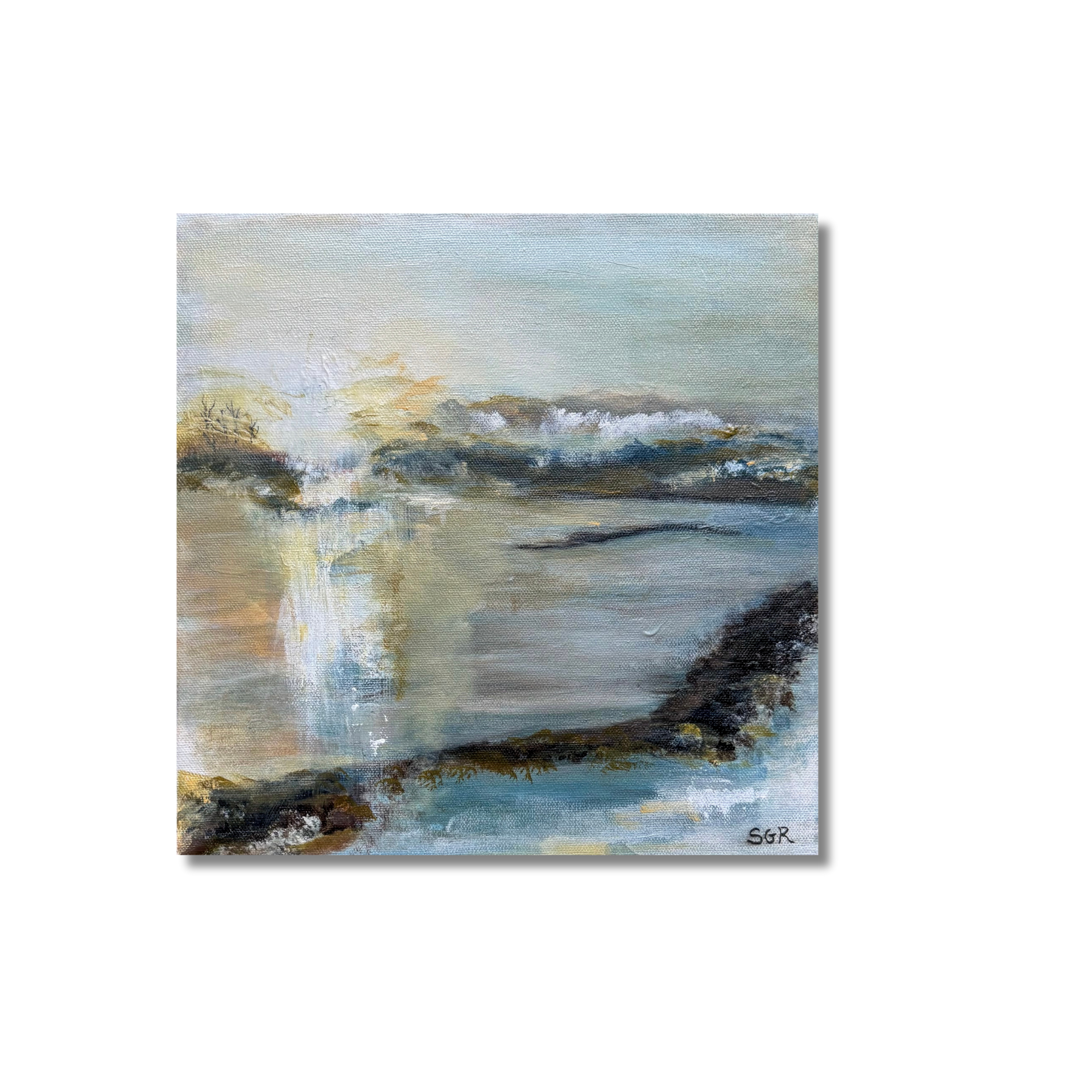 Hazy layers of ink and acrylic sweep across the canvas like early tide meeting sky. Soft, a little moody, and full of depth. “Echoes of Light” by Stephanie Rosenthal invites you to slow down and get lost in the atmosphere. Every detail feels a little dreamy and a little weathered, like an old memory that still lingers.