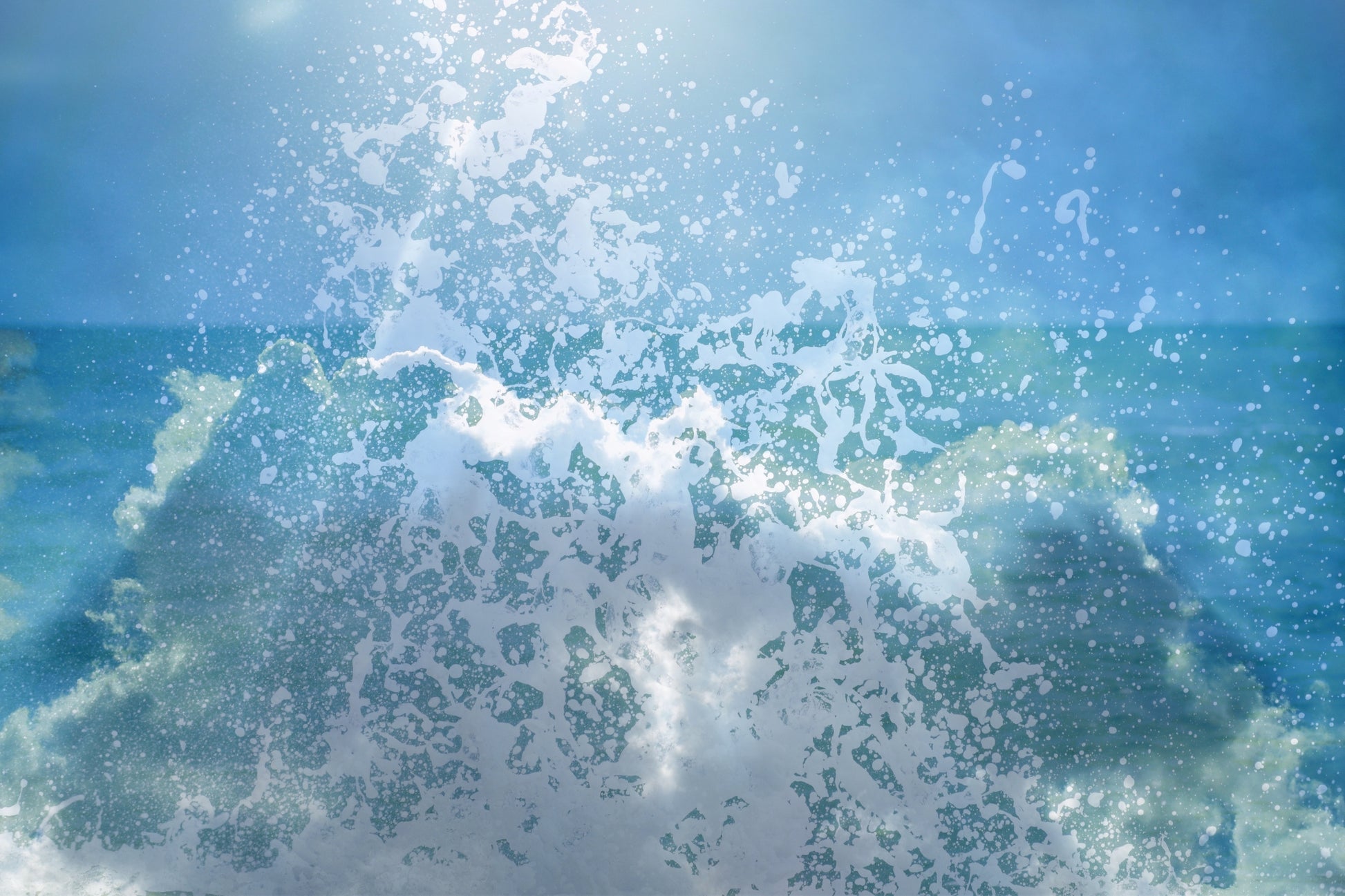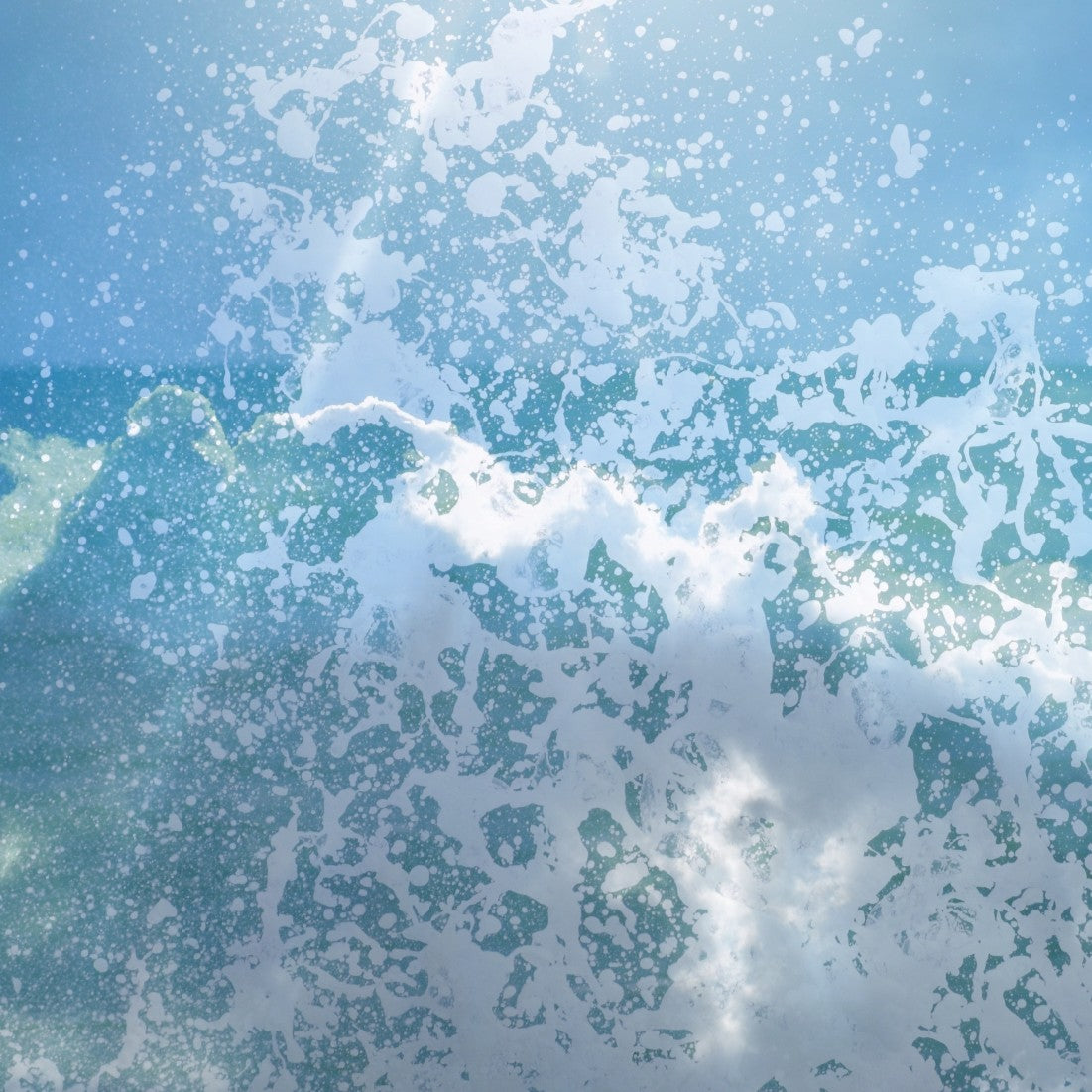 A wave crashes upward with sunlight catching the spray, creating bright highlights across the water. Layers of blue and seafoam tones move through the image, giving it a strong sense of motion while still keeping a clean, coastal look.