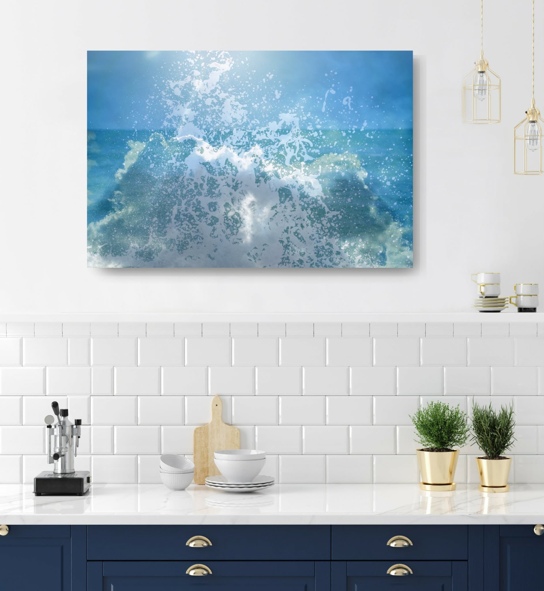 This piece brings energy into a space and works well as a focal point. The horizontal format makes it easy to place above furniture, while the brightness of the water keeps it from feeling heavy.
