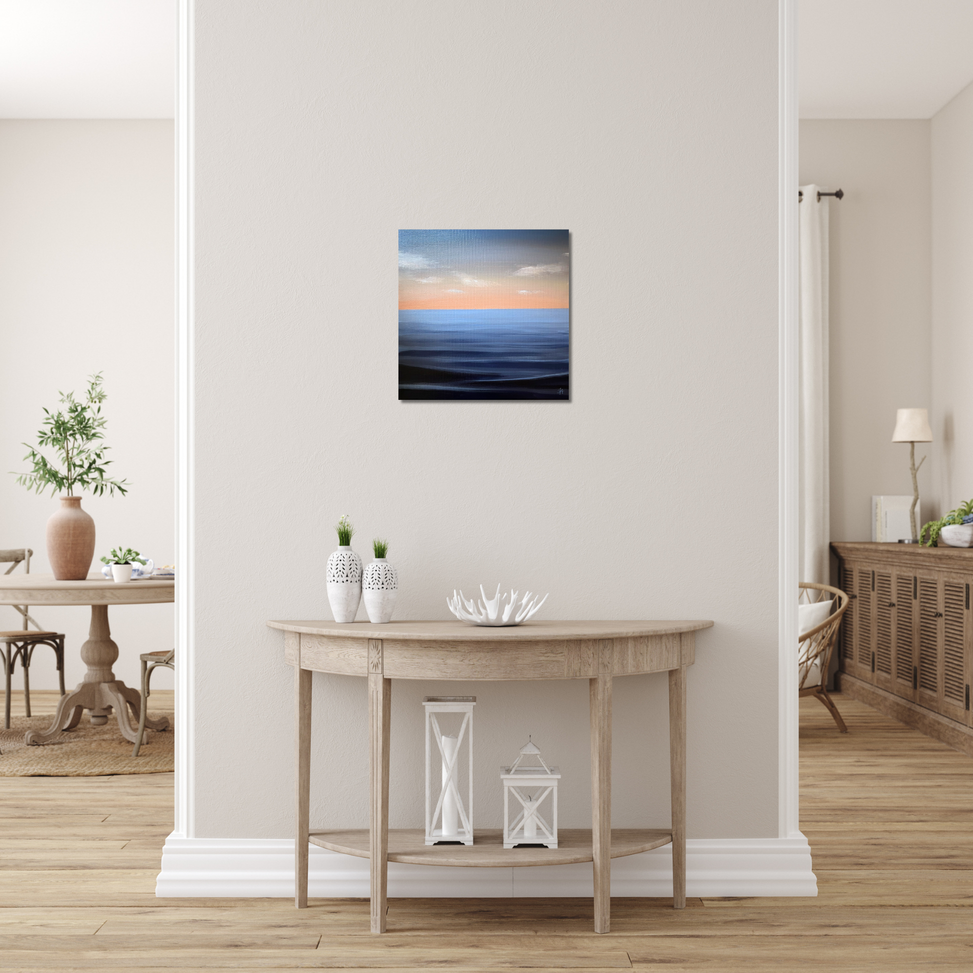Evening Ease is inspired by the calm moments just after sunset at the artist’s family lake house in Central New York. It captures that peaceful pause before nightfall, when the boats have docked, the breeze softens, and the water begins to still. With its gentle gradient of fading light over calm waters, this painting invites viewers to embrace the hush of twilight and savor the beauty of the day’s end.