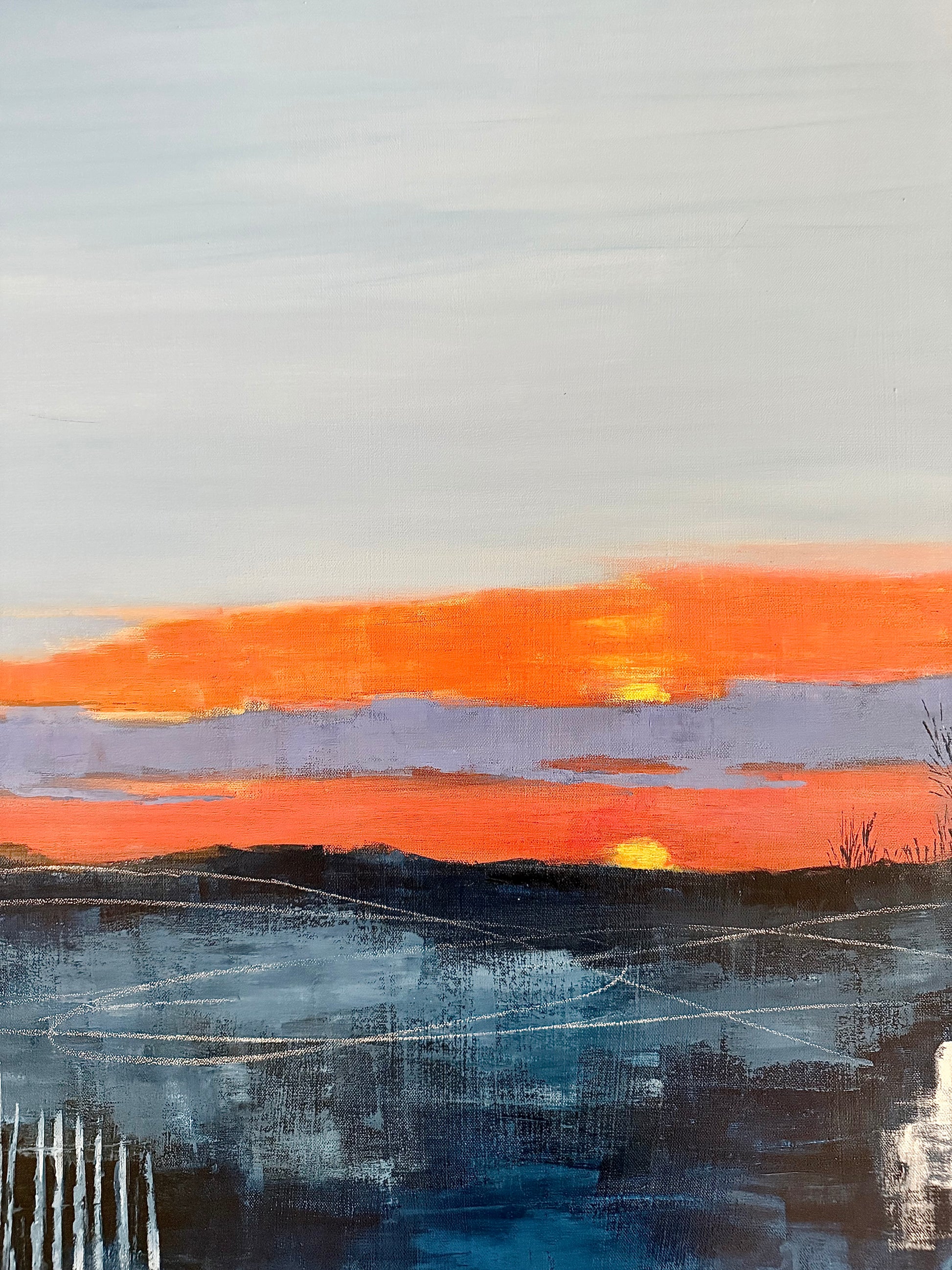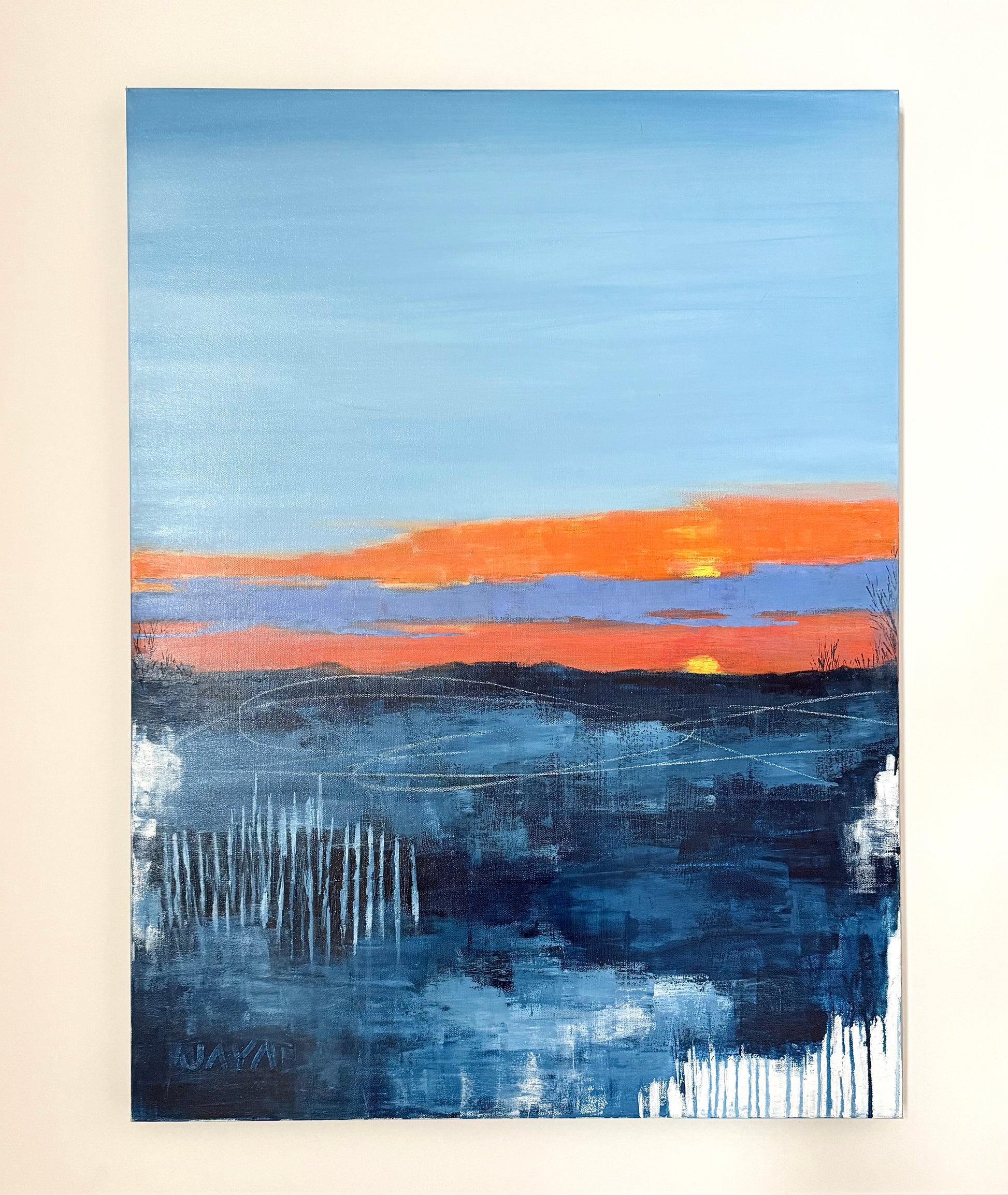 Evening Glow captures that moment when the sun dips low and everything feels a little magical. Jaya layers bold oranges, soft purples, and deep blues to create a landscape full of color and movement. The horizon line glows, the water feels alive, and the entire scene pulls you straight into a dreamy end-of-day atmosphere.