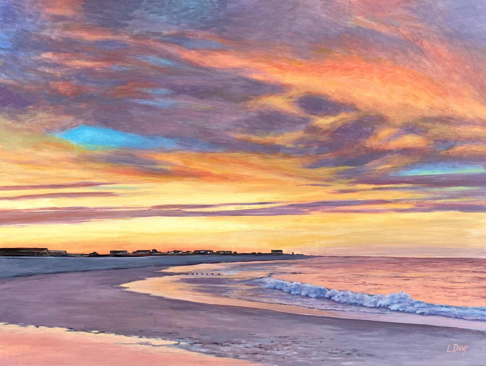 A sky that stops you mid-step. “Evening on Avon Beach” captures that magical stretch of coastline when the day gives one last glowing performance. Painted in radiant layers of golden yellow, coral, and deep lavender, this piece brings a cinematic appeal to any space.