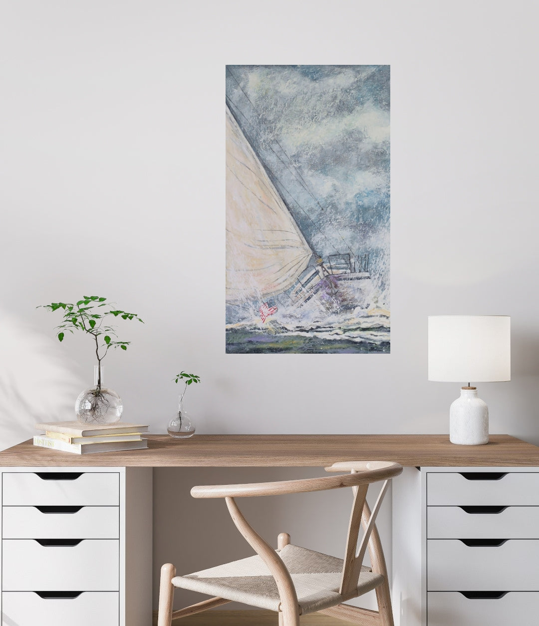 Feeling The Freedom captures the exhilarating rush of open water sailing, wind in the sails, waves crashing high, and the boat cutting fiercely through the spray. Elaine Hinchman’s use of textured mixed media brings an added sense of movement and energy, allowing viewers to almost feel the salty air and the power of the sea.