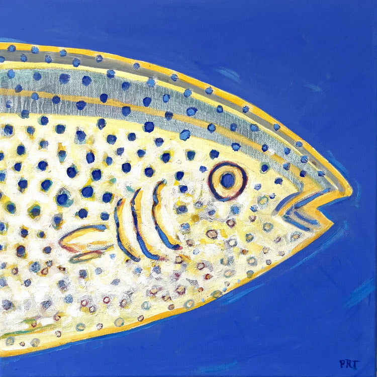 Fish Head #6 brings a bold splash of ocean color to the wall. A bright cobalt background sets the stage for this close-up of a speckled fish, where playful patterns of dots, lines, and soft yellows create a lively underwater moment.