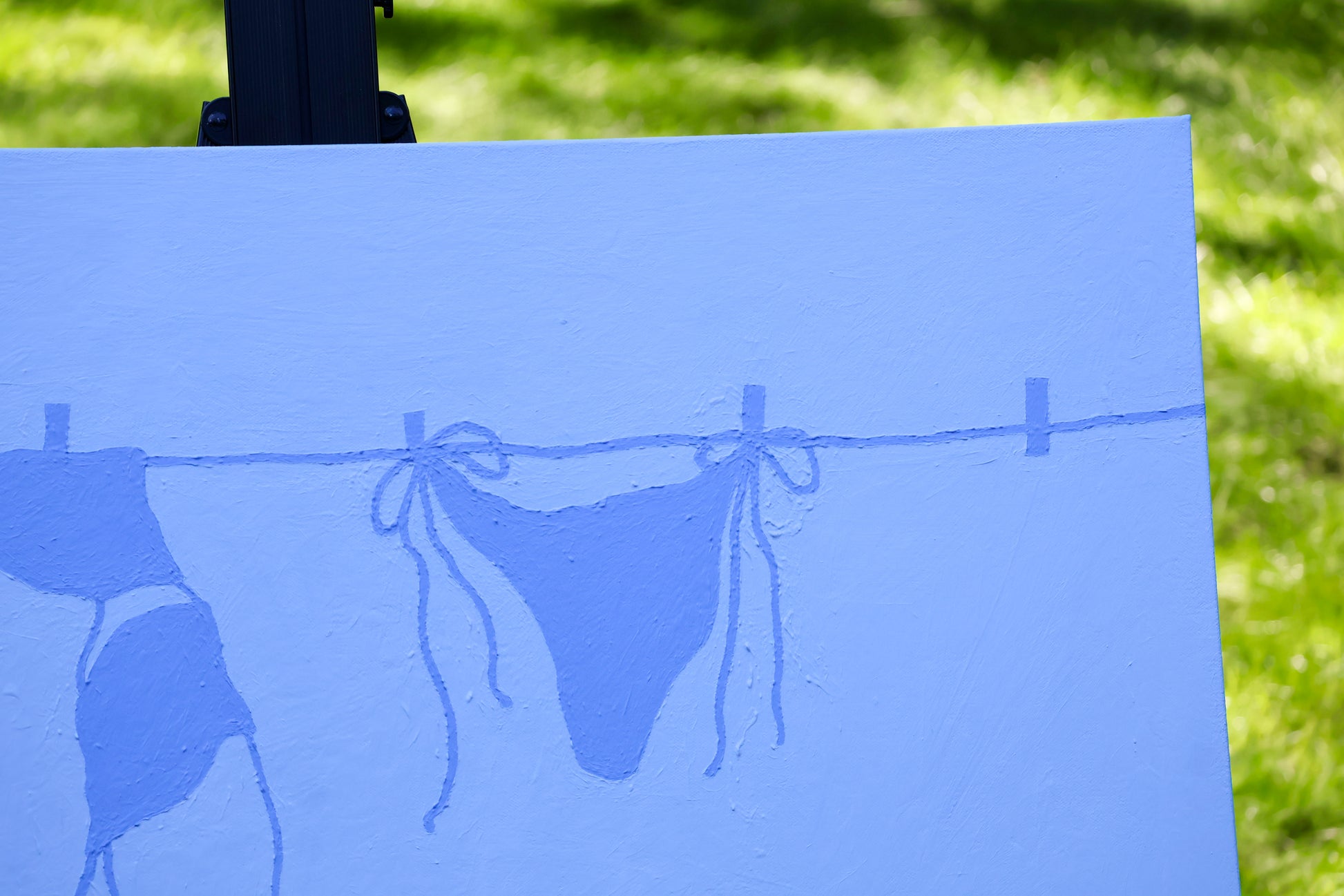 Hangin’ On is an original painting inspired by summer days on the Jersey Shore. The work recalls the clothesline that once stretched across a backyard in Beach Haven, NJ — a place where swimsuits dried in the sun after long days of boogie boarding, paddle ball, and sandy adventures. The silhouetted forms of a bikini blowing gently on the line capture a nostalgic ritual of coastal living.