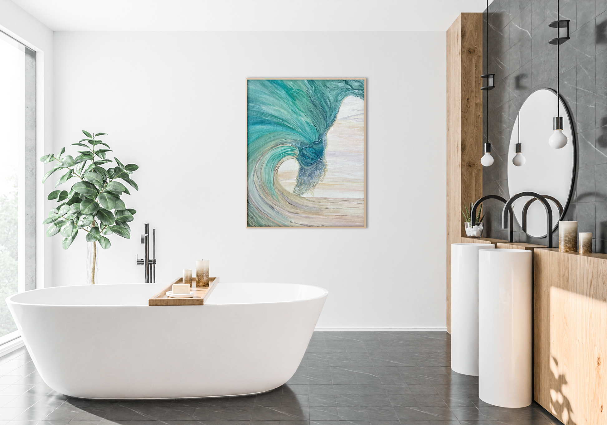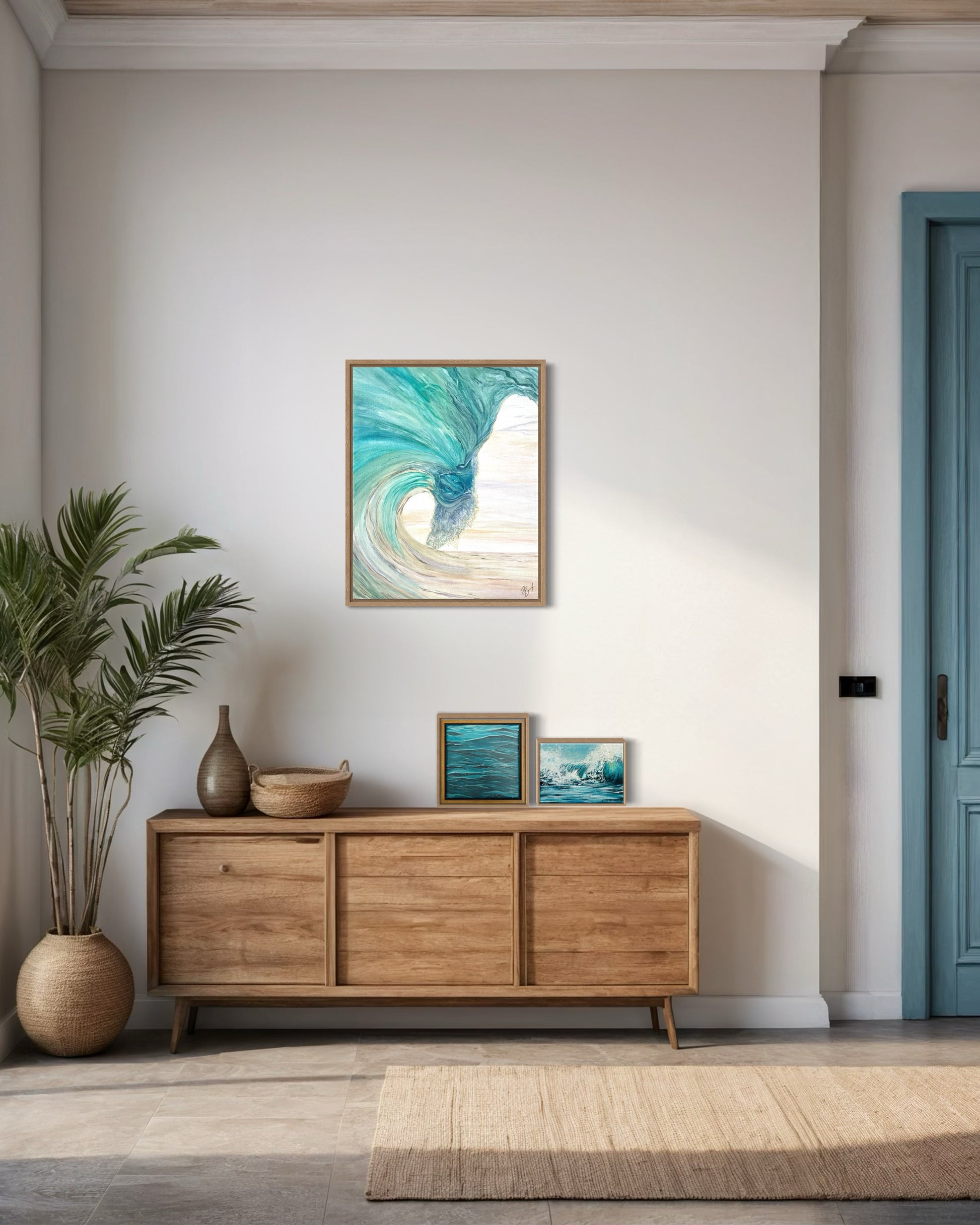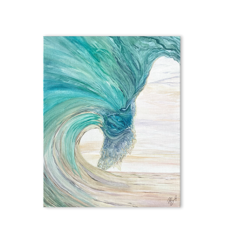 “In The Whirlwind” captures the graceful power of a wave mid-turn. Sweeping strokes of sea glass green, turquoise, and sandy neutrals create a feeling of lift and flow, as if the ocean is folding in on itself in one continuous movement.