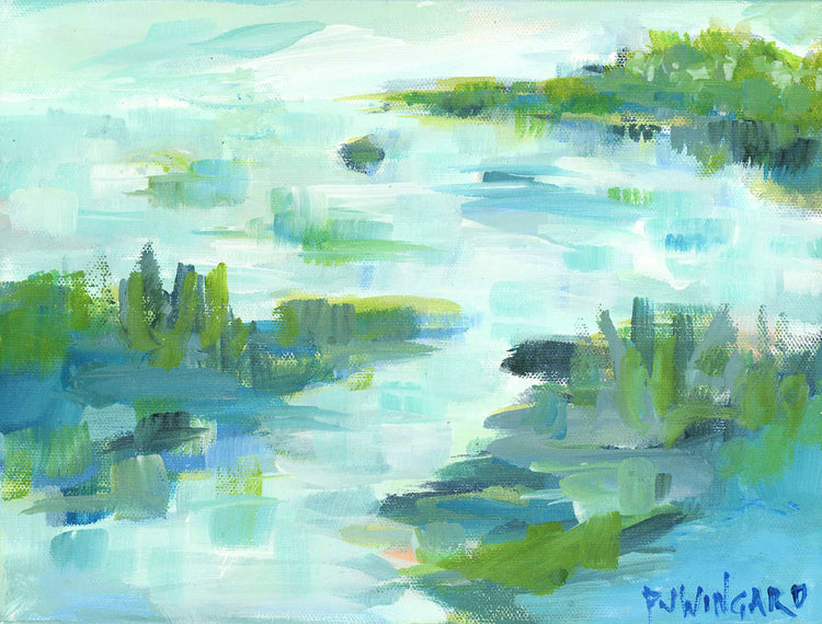 A meditation in soft blues and greens, Nowhere to Go, Nowhere to Be invites you to slow down and breathe. Inspired by quiet moments in nature, Pamela Wingard’s layered brushwork and subtle marks evoke the stillness of a peaceful morning. Where time drifts and the mind can rest.
