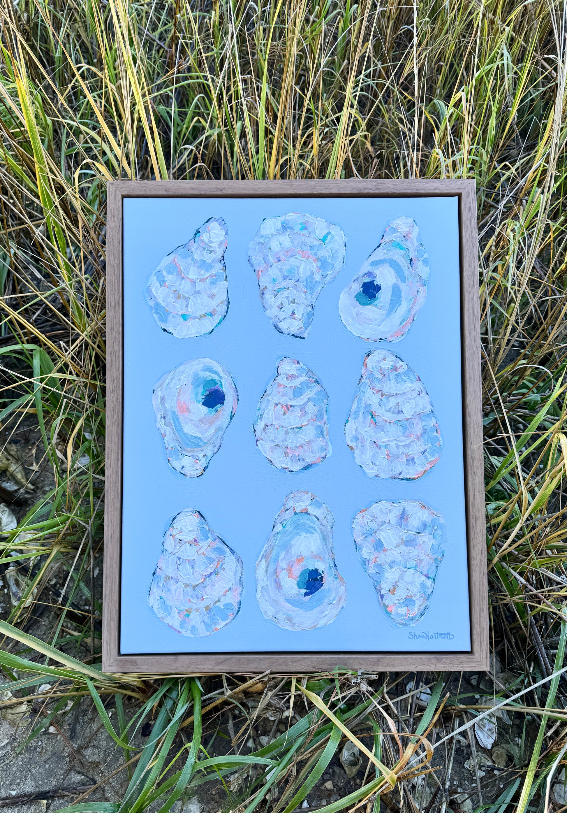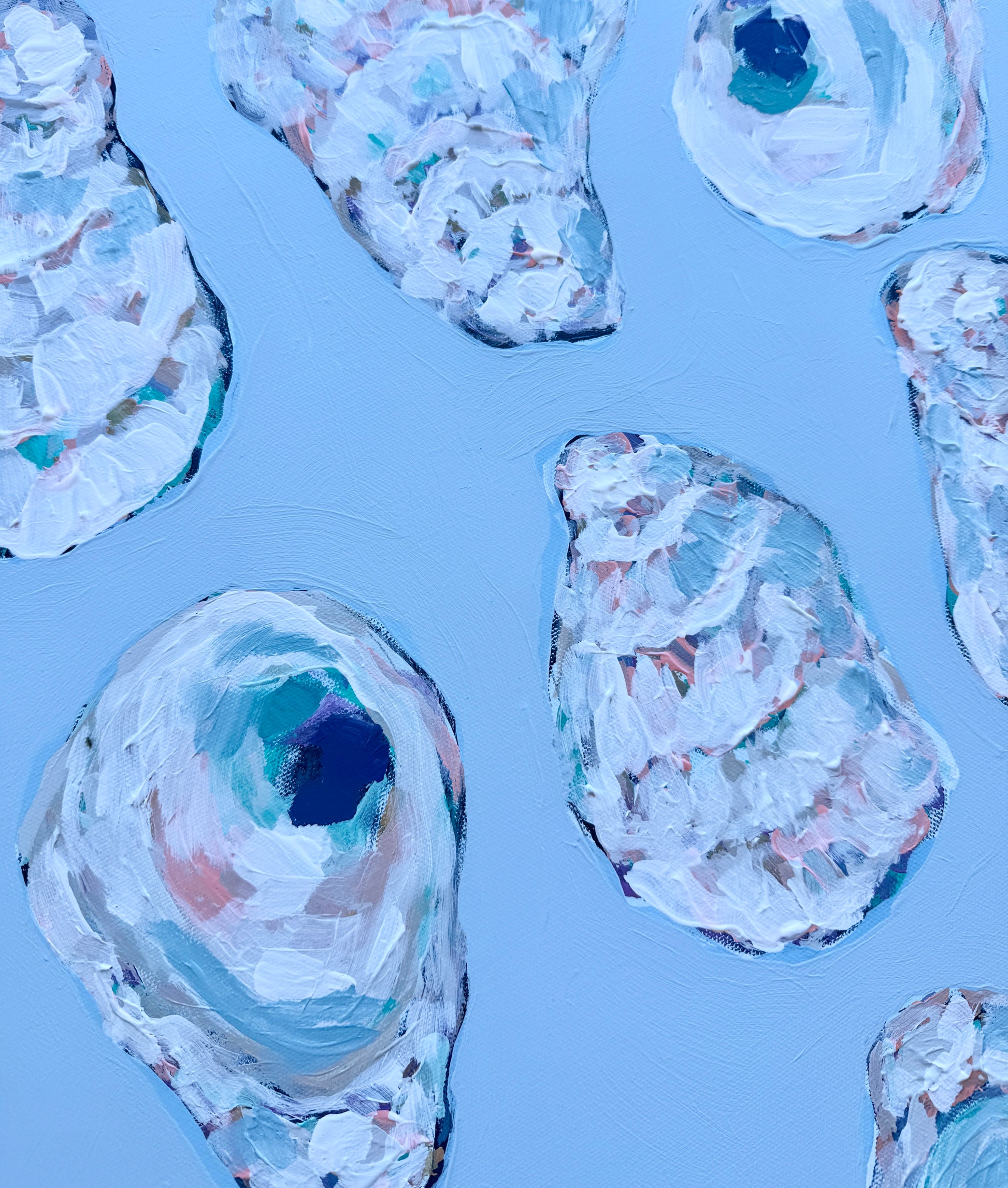 A bold and coastal-inspired statement piece, Oyster Shells features richly textured shells arranged over a soft blue backdrop. Painted in Sheri Hartnett’s signature whimsical style, this framed canvas captures the charm of the coast with pastel hues, layered texture, and a playful touch of pearl-like shine.