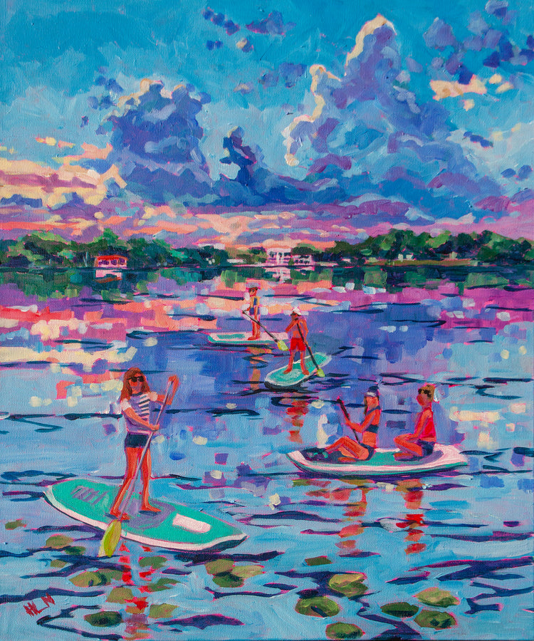 With vivid strokes and joyful light, Paddle Boarding at Sunset captures the essence of summer. Long days on the lake, golden hour skies, and laughter with friends on the water. Inspired by a radiant sunset over a Winter Park lake in Florida, this piece is alive with movement, color, and memory.