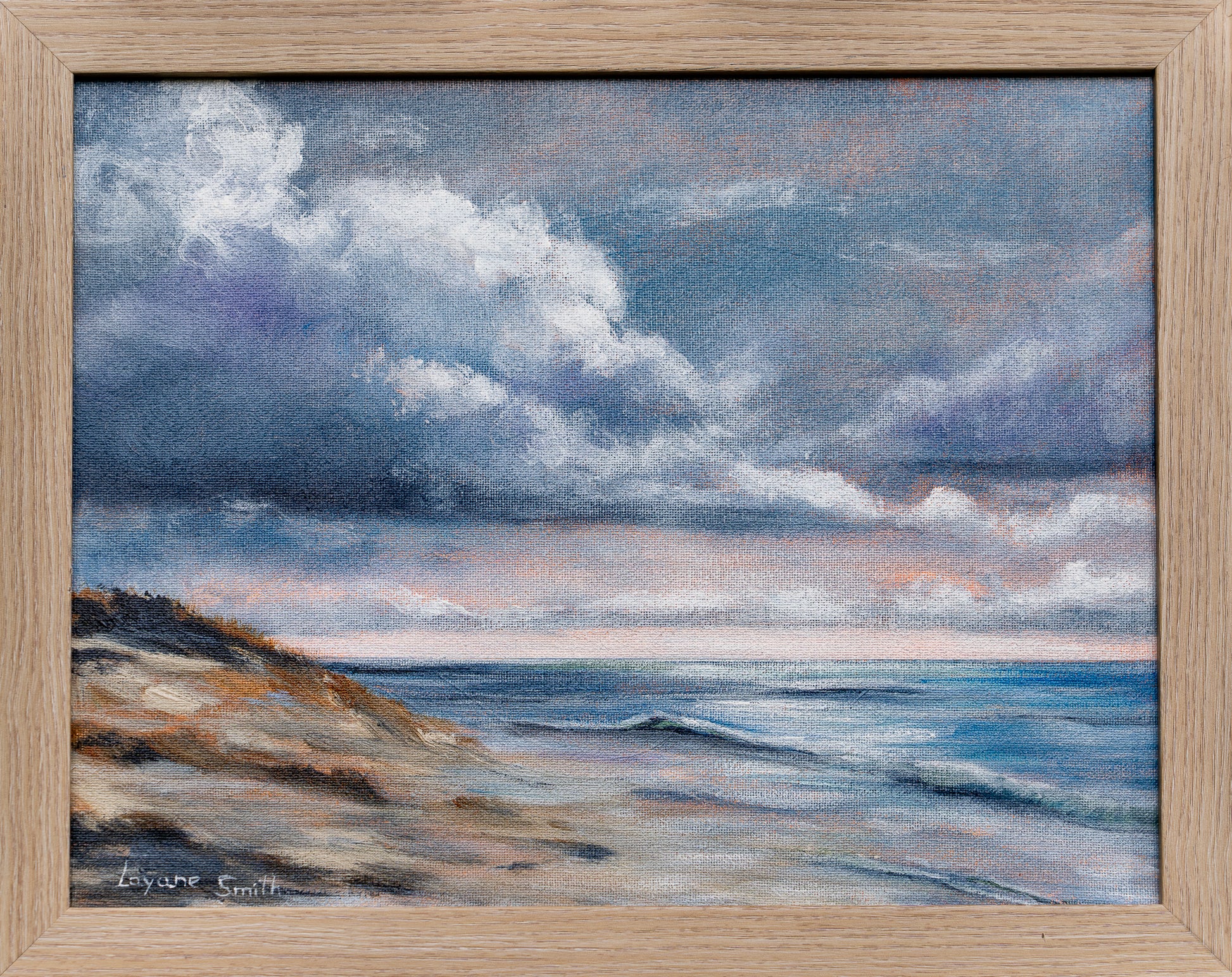 Passing Through captures a moment when heavy clouds begin to lift, revealing light breaking through the horizon. With soft, blended brushwork and a serene coastal palette, Layane Smith reflects on the quiet beauty found in change and renewal. This piece evokes a sense of hope, the reminder that even after the storm, light and calm return.