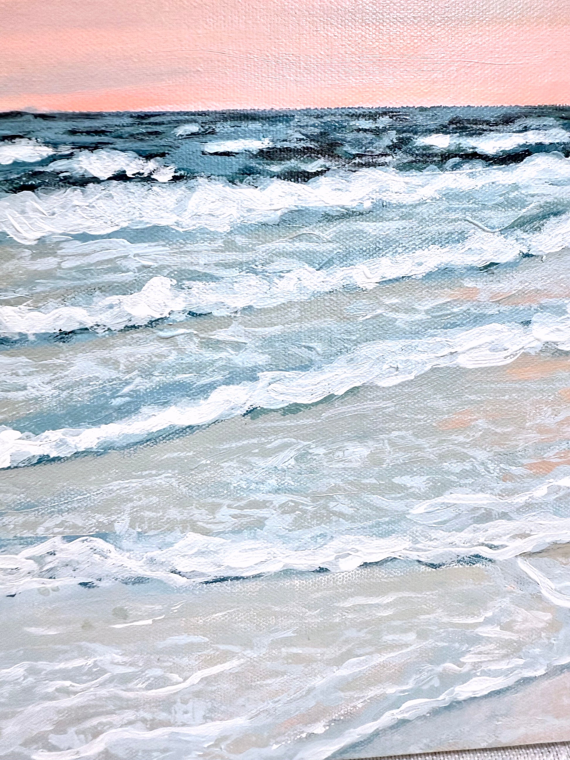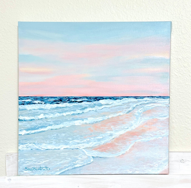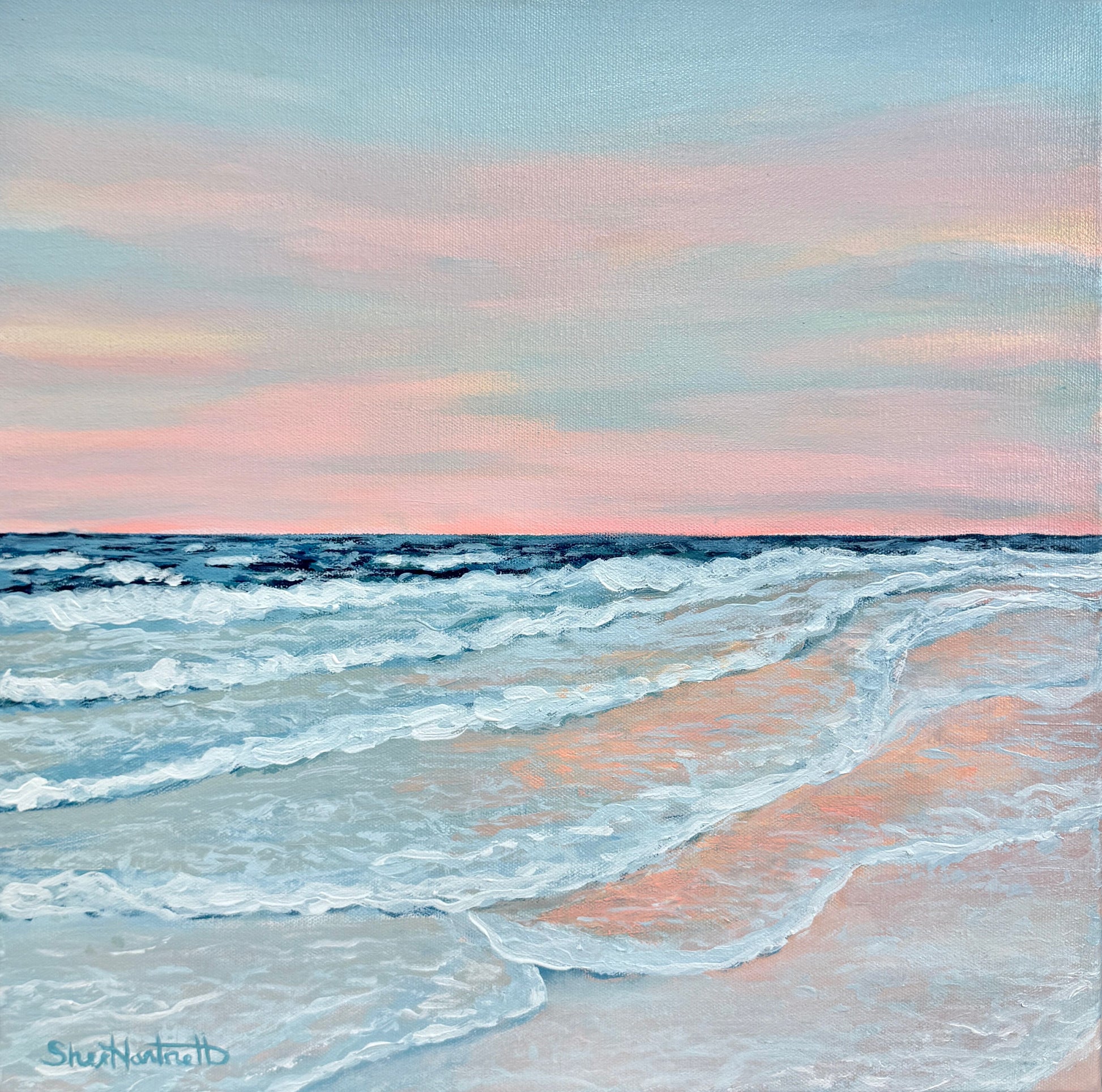 Seaside Sunset captures that magical moment when the sky turns cotton candy and the surf reflects every last shade of pink and blue. Gentle waves roll onto shore as dusk settles over the ocean. This dreamy piece by Sheri Hartnett glows with magical coastal charm.
