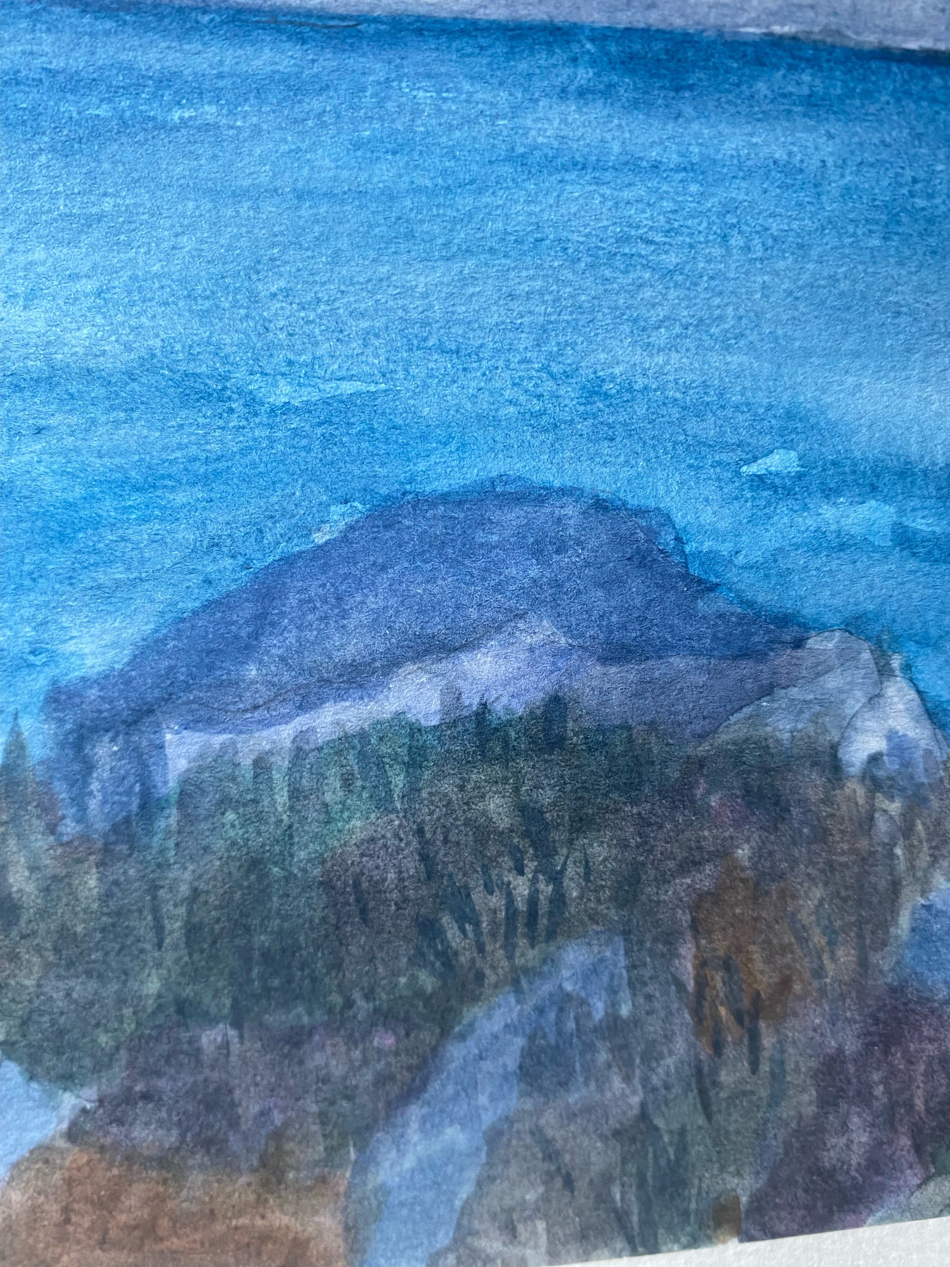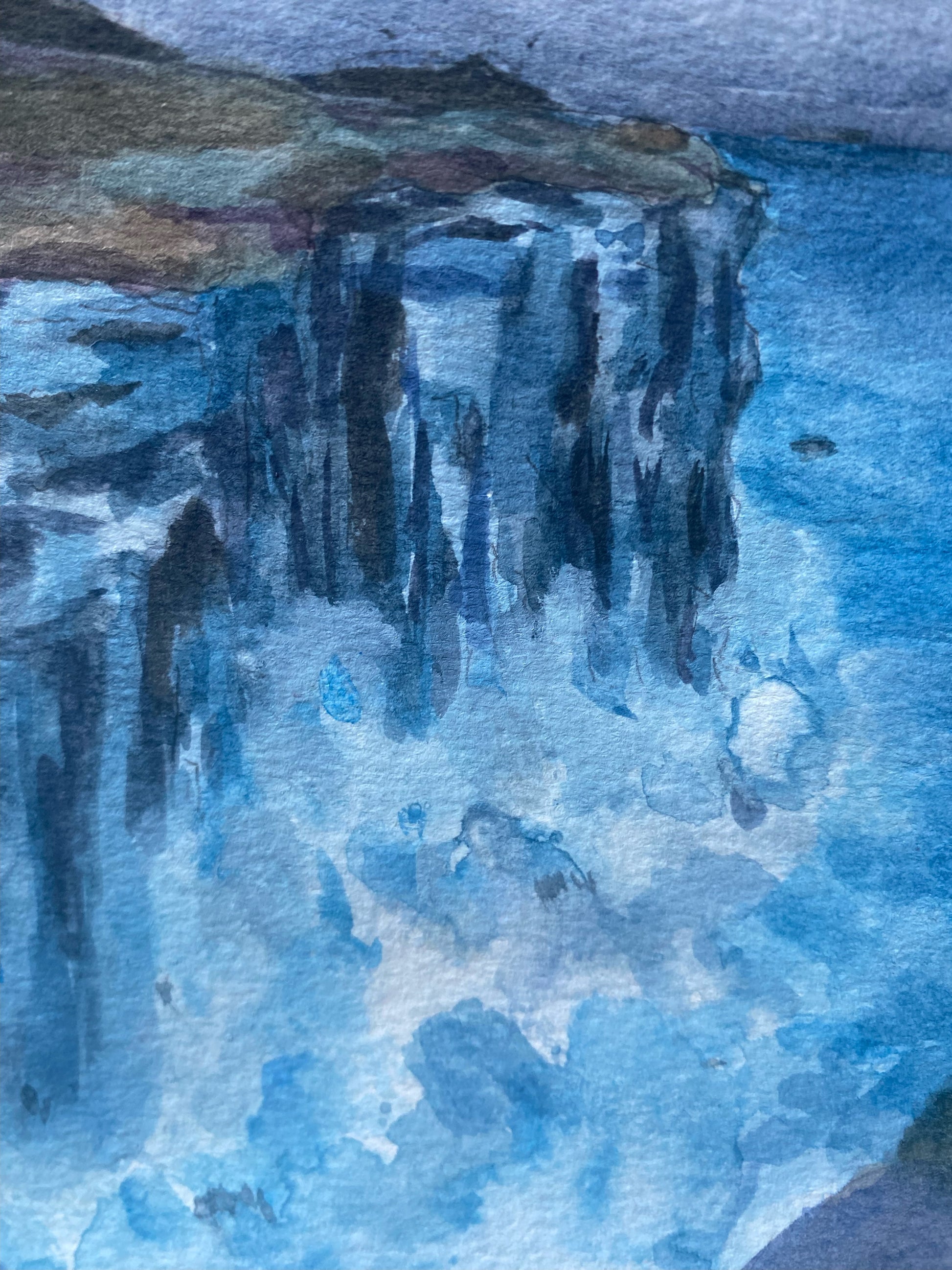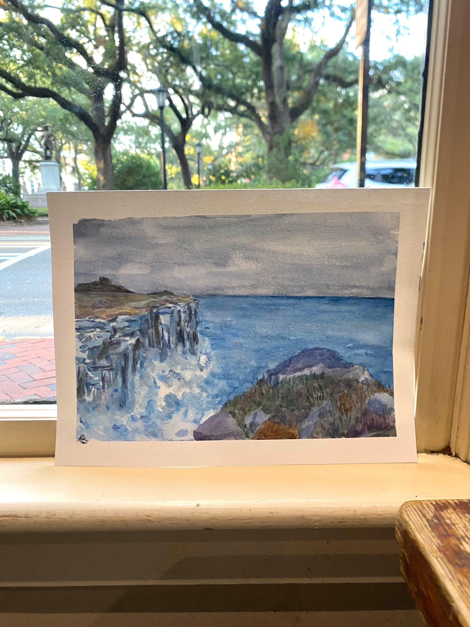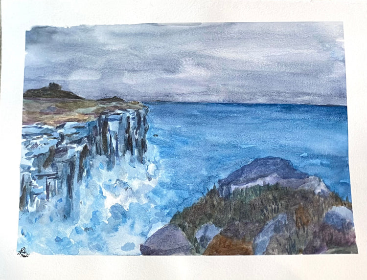 With a palette of deep blues, soft grays, and earthy cliffside tones, Solitude’s Embrace captures the quiet majesty of the coastline on a moody day. Hannah Moore’s watercolor technique brings depth and movement to the crashing waves below, while the distant horizon invites a moment of reflection.