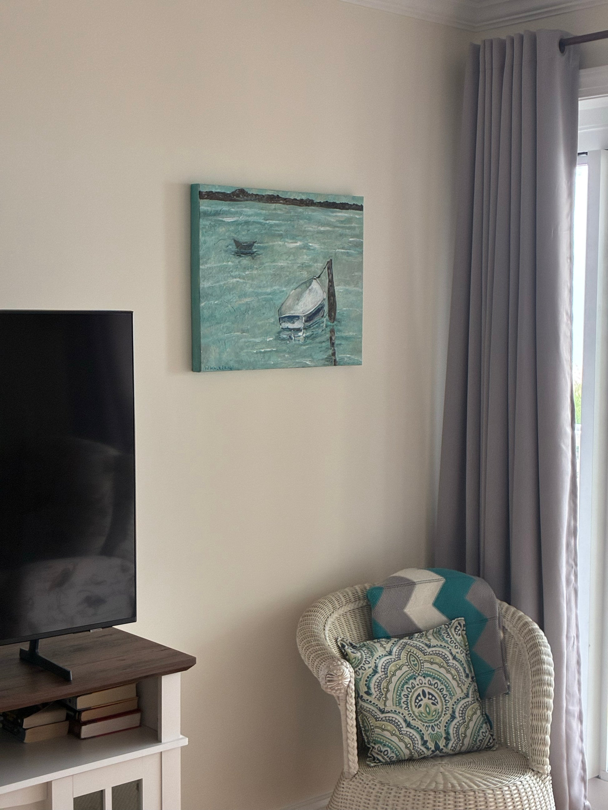 “Somewhere off Shem” pulls you right into the saltwater with its layered blues and painterly reflections. Whitney Walker gives us a coastal day that feels lived-in and a little weathered in the best way. A beached boat, a rippling tide, and that telltale stillness before a storm.
