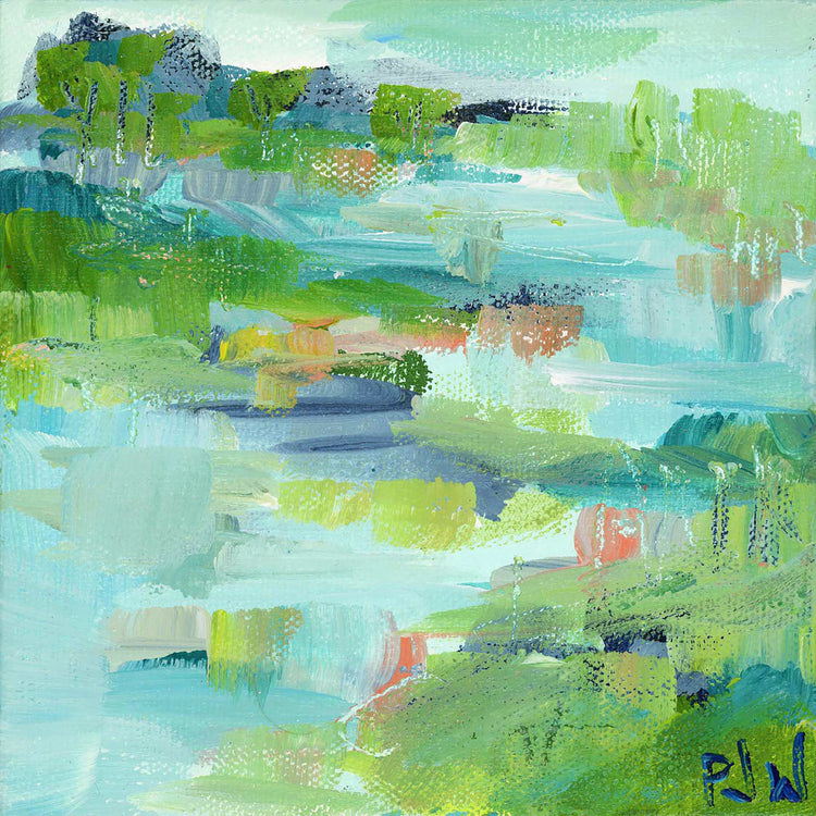 In a swirl of soft blues, citrusy greens, and sun-warmed brushstrokes, Why Worry? offers a cheerful reminder to let go and breathe deep. Inspired by the peace that water brings to a busy mind, Pamela Wingard’s expressive marks invite you into a moment of lightness and perspective.